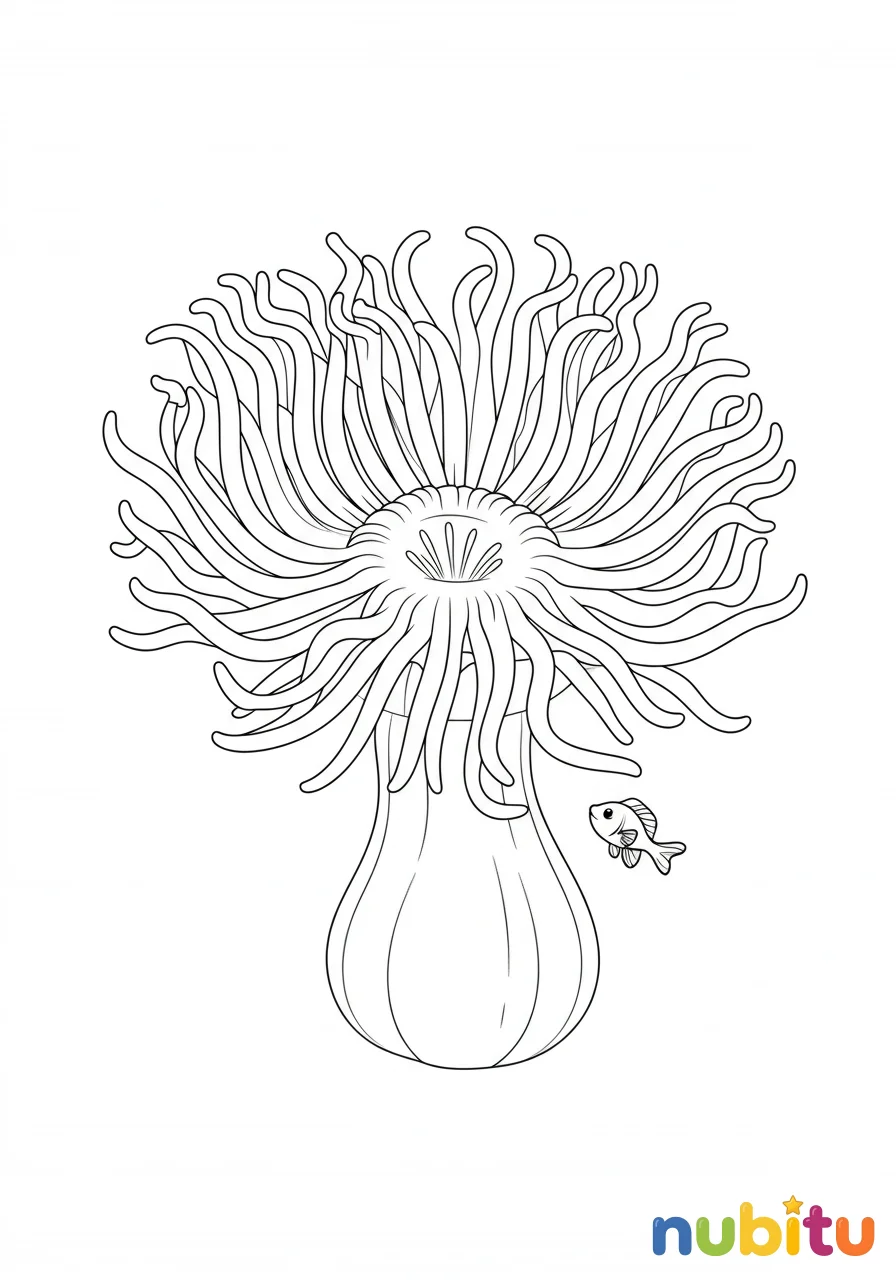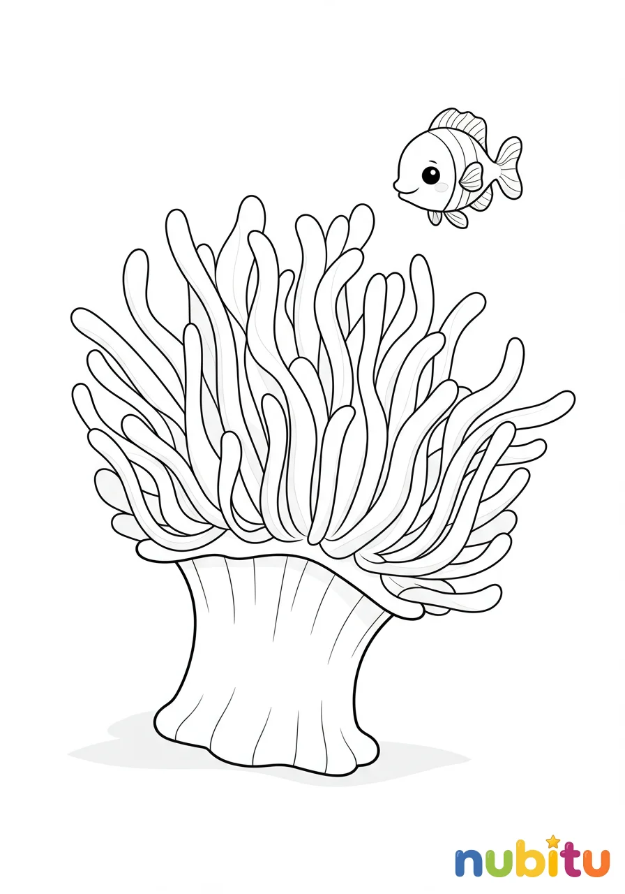 ¡Mira qué anémona tan feliz! Sus tentáculos suaves están listos para que los llenes de colores brillantes. ¿Quién crees que se esconde entre ellos? ¡Un pequeño pececito juguetón!