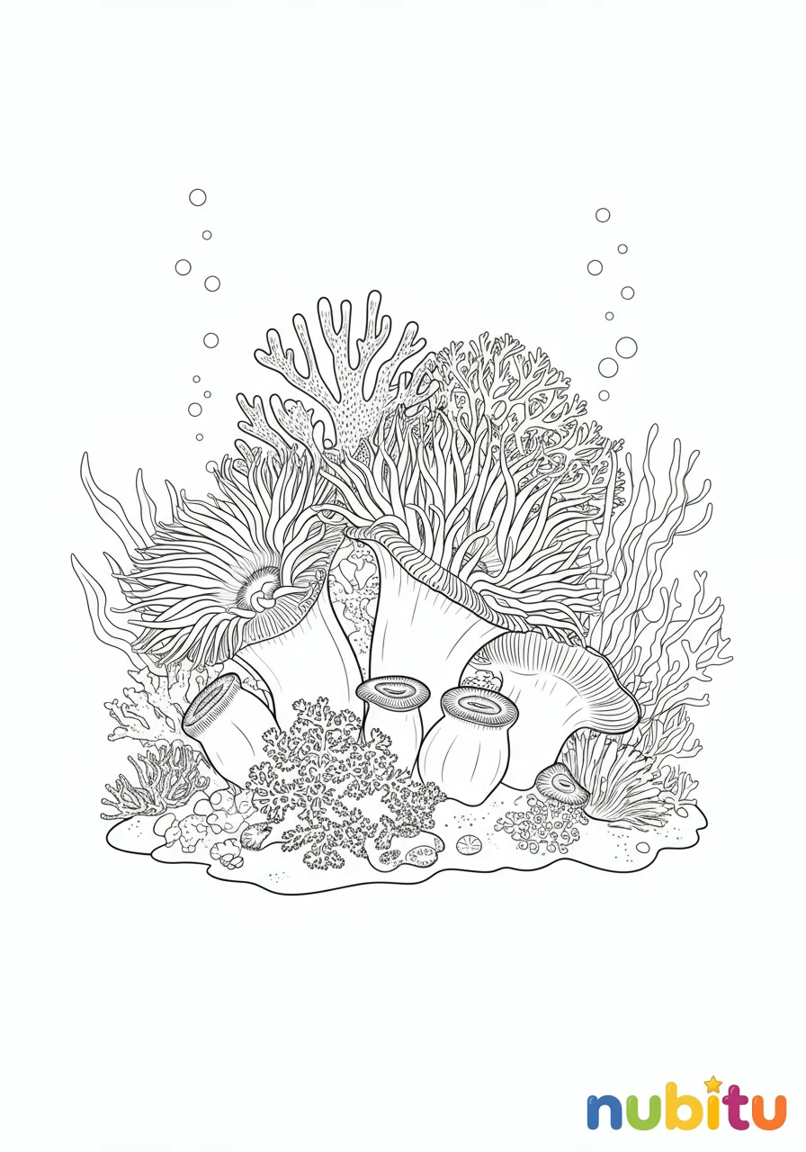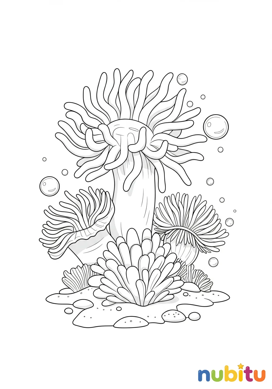 ¡Un grupo de anémonas bailando bajo el mar! Cada una tiene una forma diferente y está esperando tus lápices de colores para brillar. ¿Cuántos tentáculos puedes encontrar?