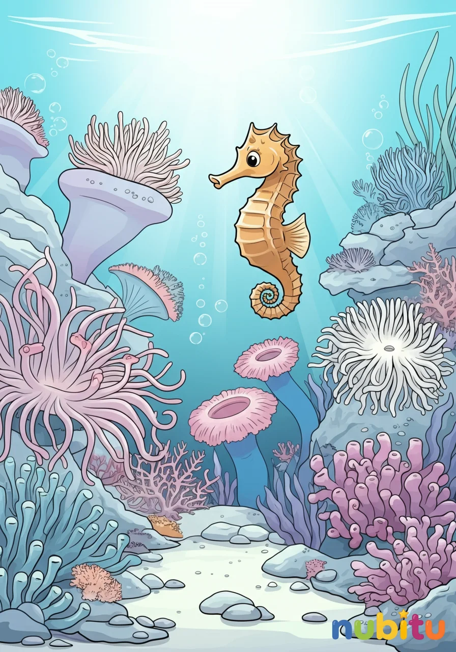 ¡Sumérgete en este jardín mágico! Anémonas de todos los tamaños y formas crean un hogar para un amigable caballito de mar. ¡Imagina todos los colores que puedes usar para que este jardín cobre vida!
