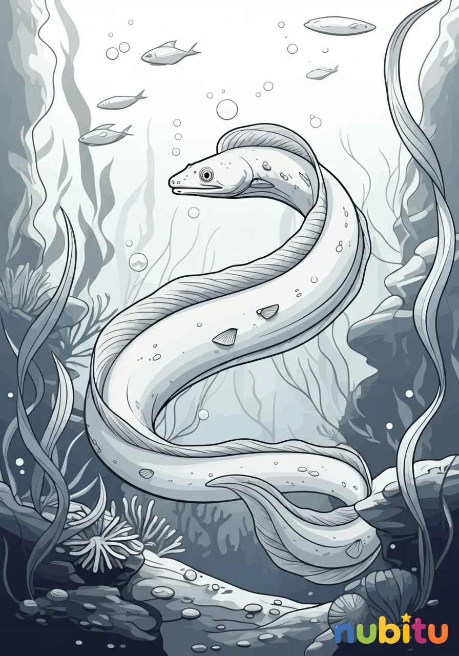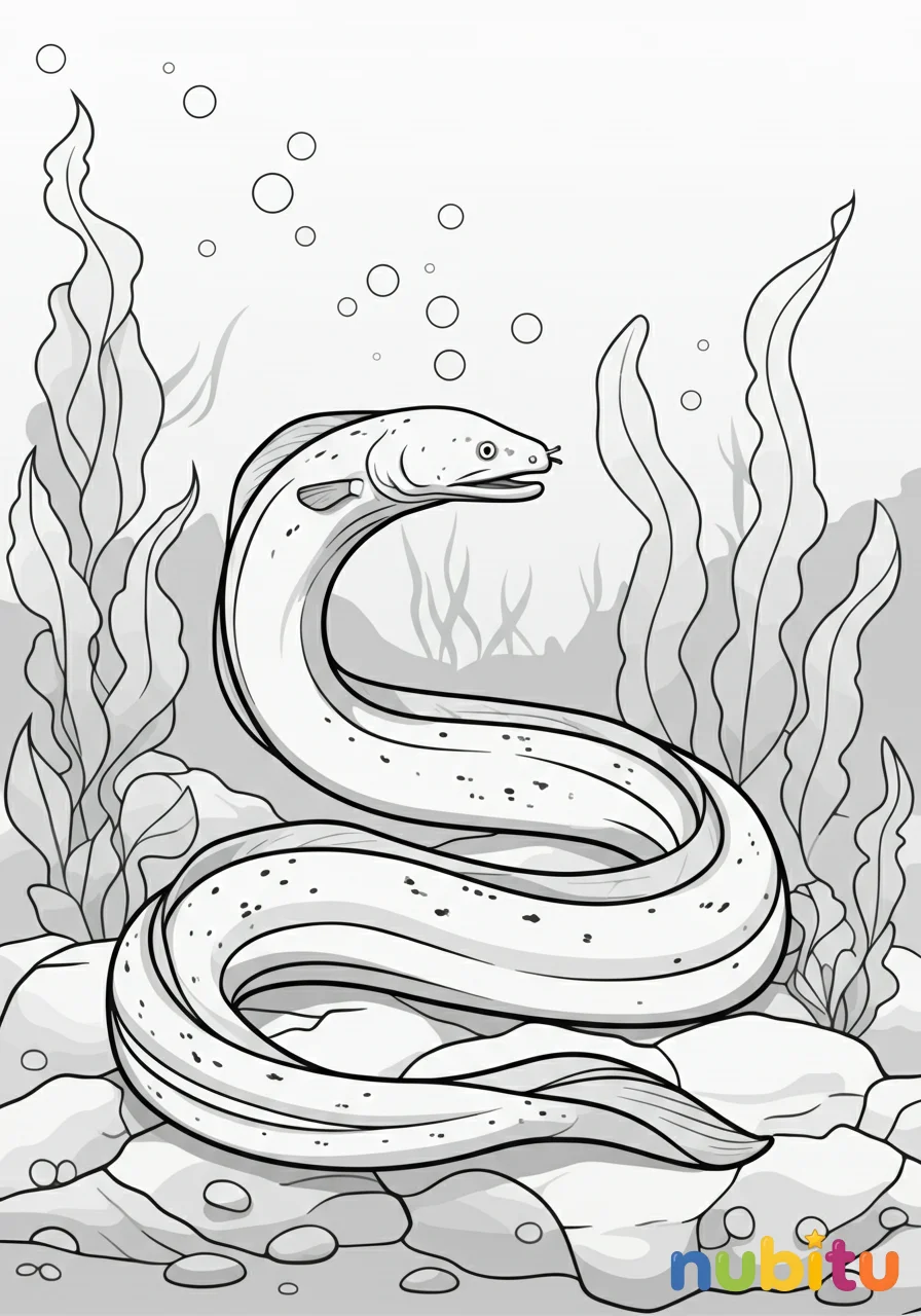 Esta anguila es muy curiosa y está nadando en el mar. ¡Imagina qué colores le pondrías al agua y a su cuerpo para que sea la más bonita!