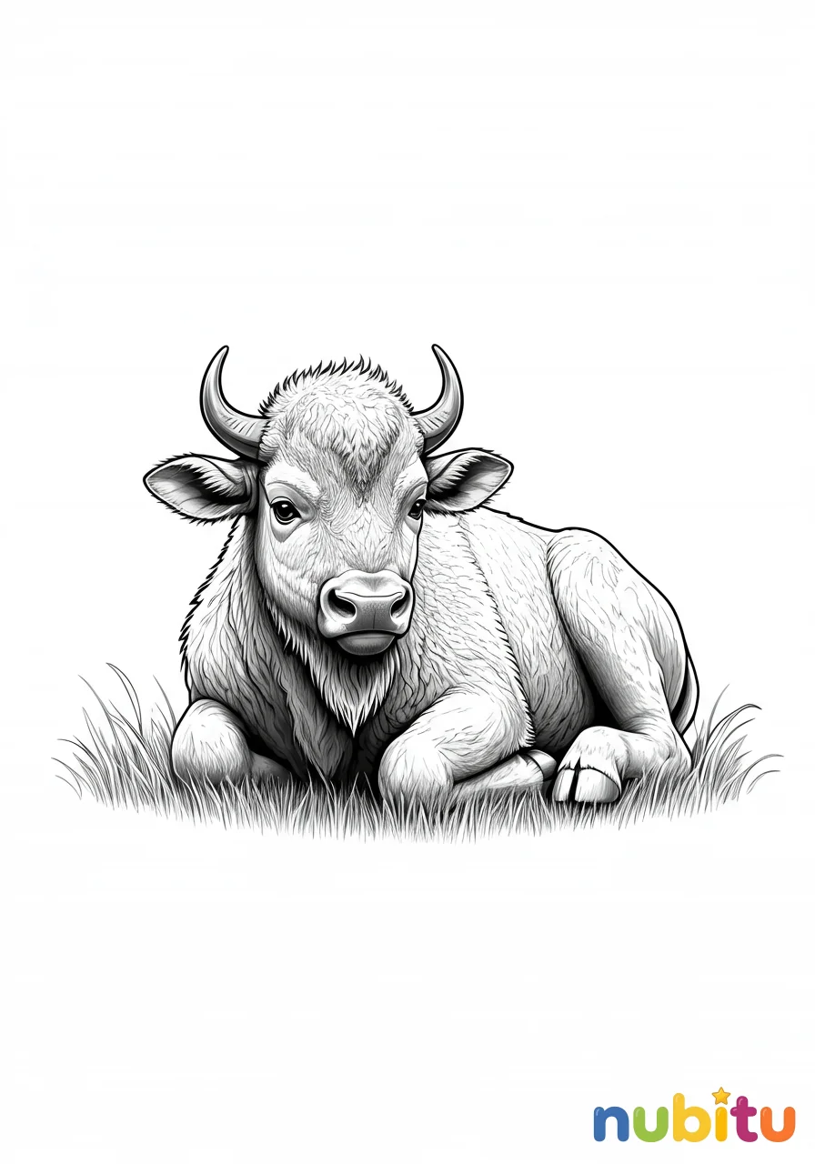 Un encantador dibujo de un pequeño búfalo, un ternero, descansando pacíficamente en un campo. Sus formas suaves y su tamaño más manejable ofrecen una oportunidad para explorar la ternura y la potencia en una etapa temprana.