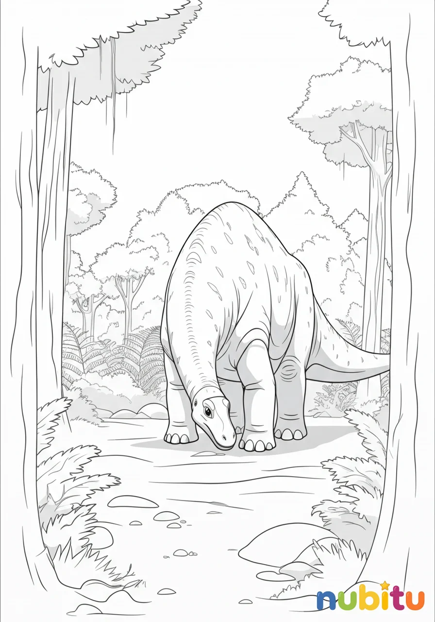 Un dibujo tierno y detallado de un Aeolosaurus pastando tranquilamente entre vegetación exuberante, capturando la majestuosidad de este gigante prehistórico en su hábitat natural. Las líneas son claras y fáciles de seguir, perfectas para pequeños artistas.