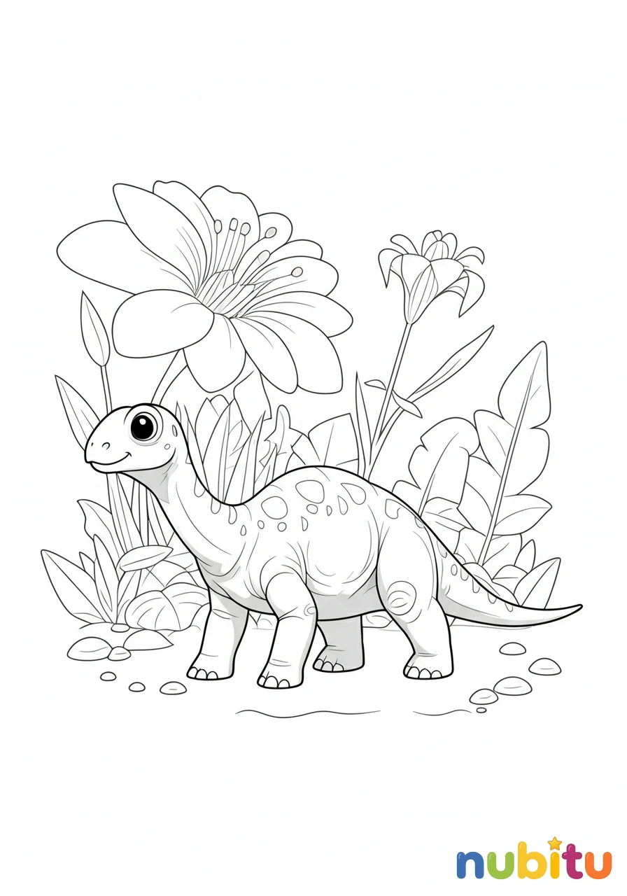 Una adorable ilustración de un pequeño Aeolosaurus bebé, con ojos curiosos, dando sus primeros pasos cerca de una flor gigante. Este diseño está lleno de encanto y es ideal para los más pequeños, invitándolos a imaginar la vida de un dinosaurio joven.