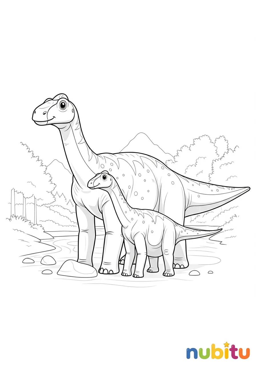 Una conmovedora escena familiar donde un Aeolosaurus adulto protege a su cría, ambos representados con líneas suaves y expresivas. Se encuentran cerca de un río sereno, transmitiendo una sensación de calma y conexión en el mundo prehistórico.