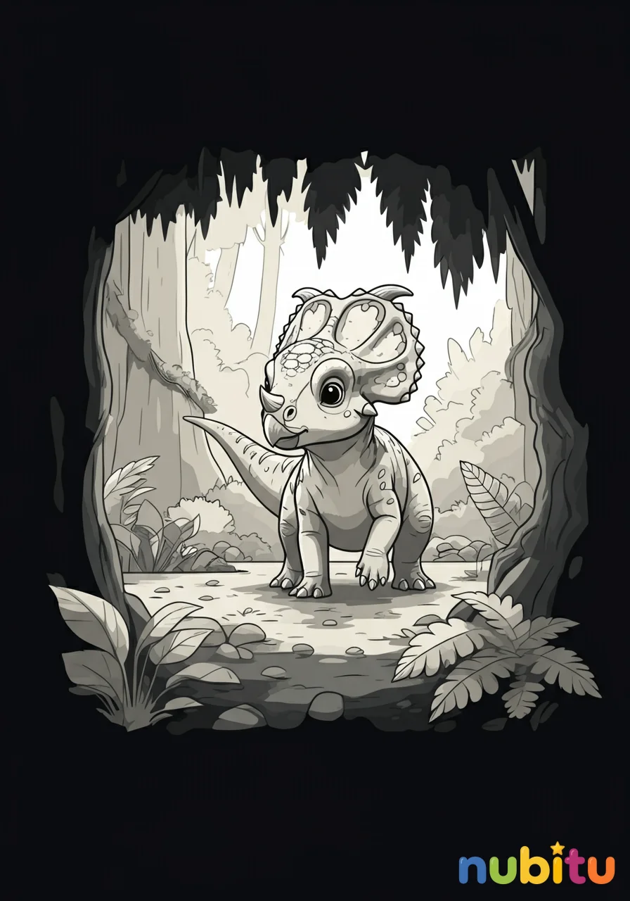 Un día, mientras el sol apenas asomaba sus primeros rayos dorados sobre el valle de las Rocas Rugientes, Nubitu, con su mochila de explorador y un brillo de curiosidad en los ojos, tropezó con algo extraordinario. No era una roca, ni un árbol, sino un hueso gigante, tan grande como su propia cama. ‘¡Guau!’, exclamó, con el corazón latiendo a mil por hora. ‘¡Esto es enorme!’. Siguiendo el rastro de otros huesos similares, Nubitu se adentró en una cueva misteriosa, donde el aire era fresco y olía a tierra antigua. Dentro, las paredes estaban cubiertas de dibujos. No eran dibujos cualquiera; eran imágenes de criaturas majestuosas con grandes cuernos y un escudo óseo en la cabeza. Nubitu reconoció de inmediato a uno de sus dinosaurios favoritos: el Agathaumas. Pero estos dibujos tenían algo especial; parecían incompletos, como si esperaran ser terminados. ‘¡Necesitan color!’, susurró Nubitu, sacando su estuche de lápices mágicos. Con cada trazo, el Agathaumas de la pared cobraba vida. Primero, un verde esmeralda para su piel rugosa, luego un amarillo brillante para sus cuernos protectores. Nubitu imaginó cómo sería ver a uno de verdad, pastando tranquilamente entre helechos gigantes. Se concentró en cada detalle, en las escamas, en la expresión amable de su rostro, en la forma en que sus patas fuertes sostenían su cuerpo inmenso. La cueva, que antes parecía solo un montón de rocas, ahora se llenaba de la energía de un mundo prehistórico que Nubitu estaba recreando con sus colores. Al terminar el último dibujo, un suave resplandor llenó la cueva. Las imágenes de los Agathaumas parecían moverse, susurrando historias de un tiempo lejano. Nubitu sonrió. Había descubierto no solo un lugar mágico, sino también el poder de su propia imaginación para dar vida a los sueños. Salió de la cueva sintiéndose el artista más valiente y feliz del mundo, listo para compartir la maravilla de los Agathaumas con todos sus amigos.