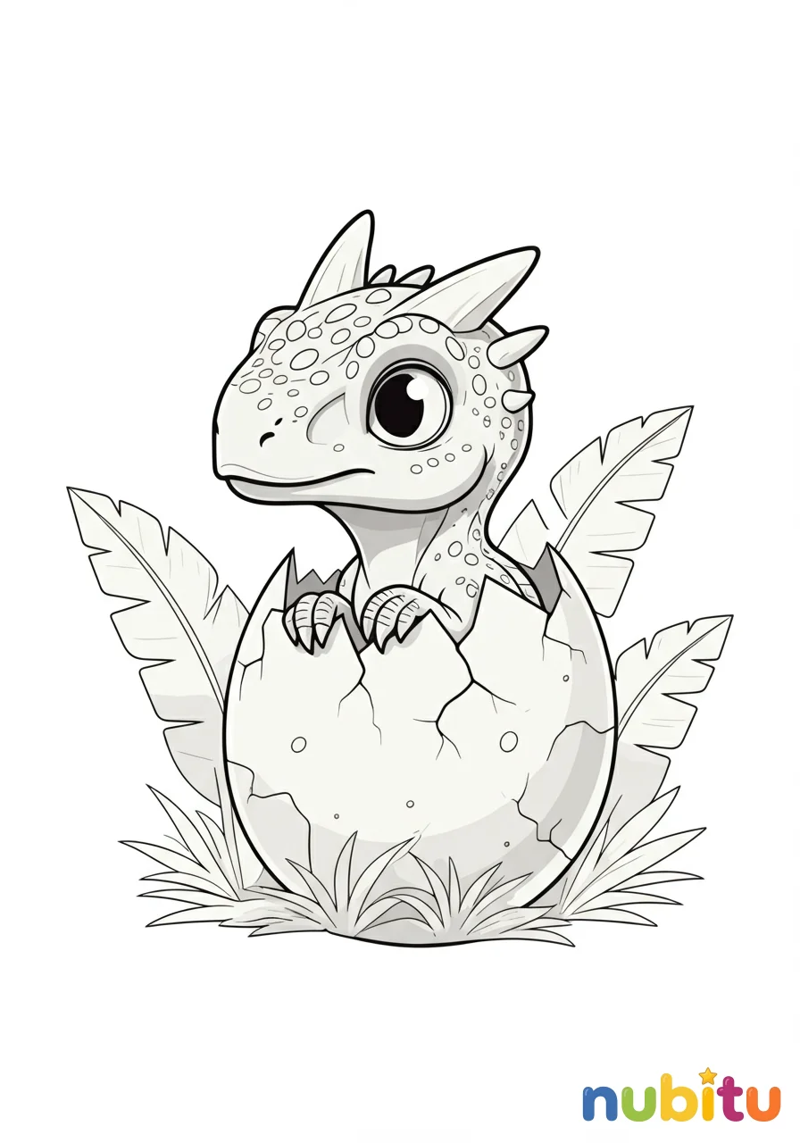 Una tierna ilustración de un Austroraptor joven, recién salido del huevo, mirando con curiosidad su nuevo mundo lleno de plantas exóticas y misterio.