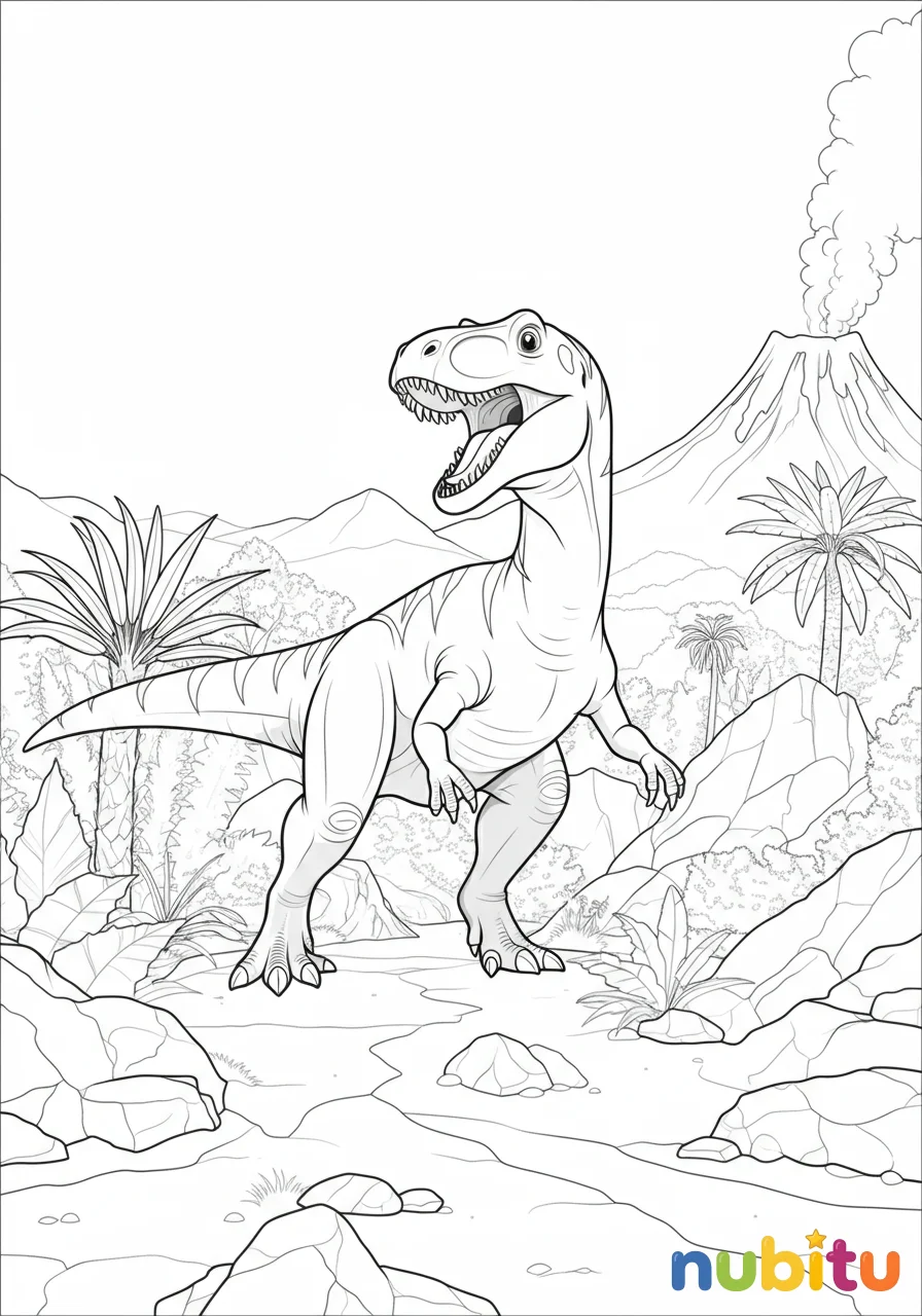 • Finalmente, puedes dibujar un fondo jurásico con árboles, montañas o un volcán para que tu Daspletosaurus se sienta como en casa. ¡Y listo, una obra de arte jurásica!