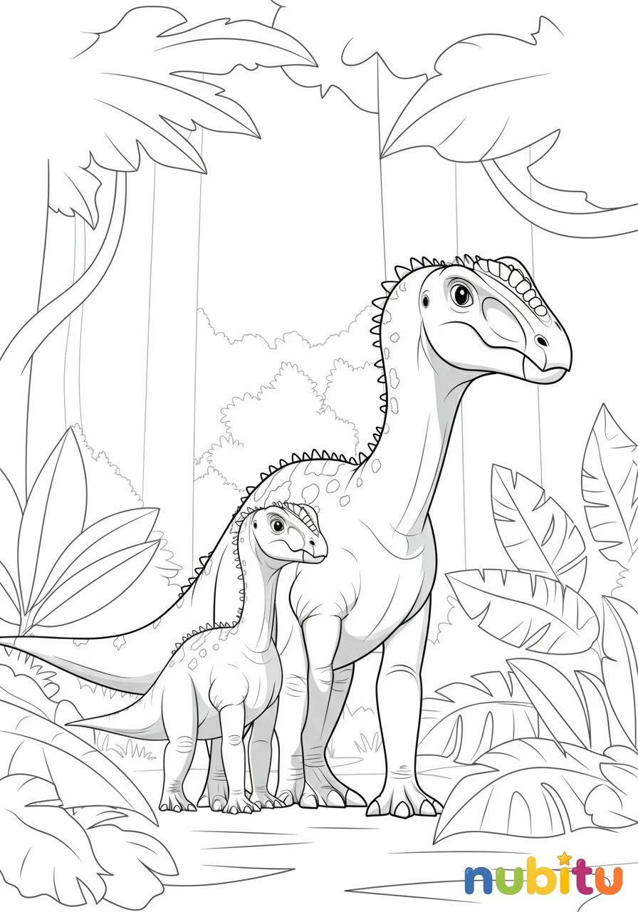 Una tierna escena donde un pequeño y curioso Dreadnoughtus bebé se asoma con inocencia, protegido por la imponente presencia de su madre. Juntos, exploran el denso follaje, mostrando el lado familiar y gentil de estos colosos prehistóricos.