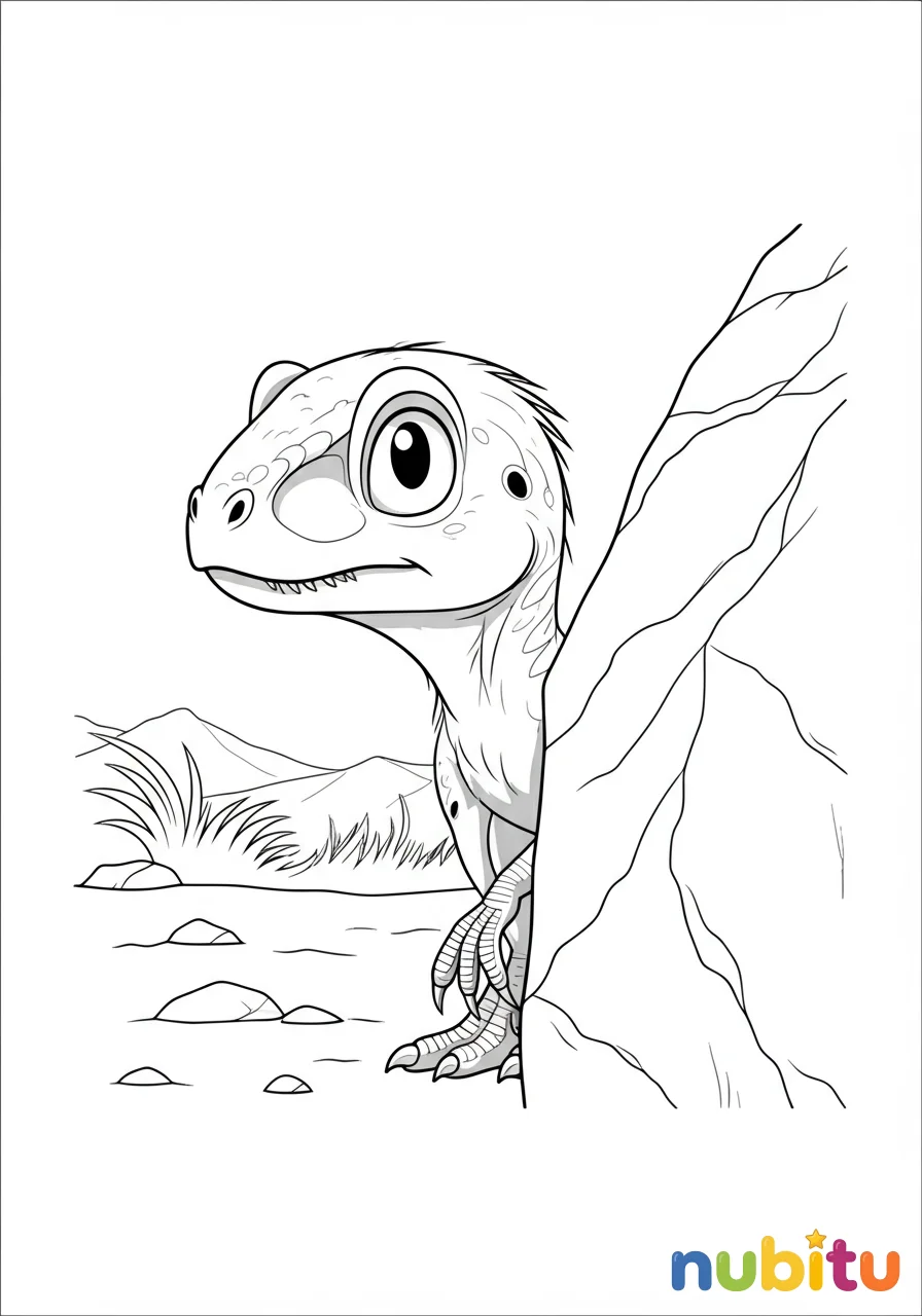 Un graciliraptor joven, con una expresión de curiosidad, asomándose desde detrás de una roca grande, observando el mundo con atención y cautela.