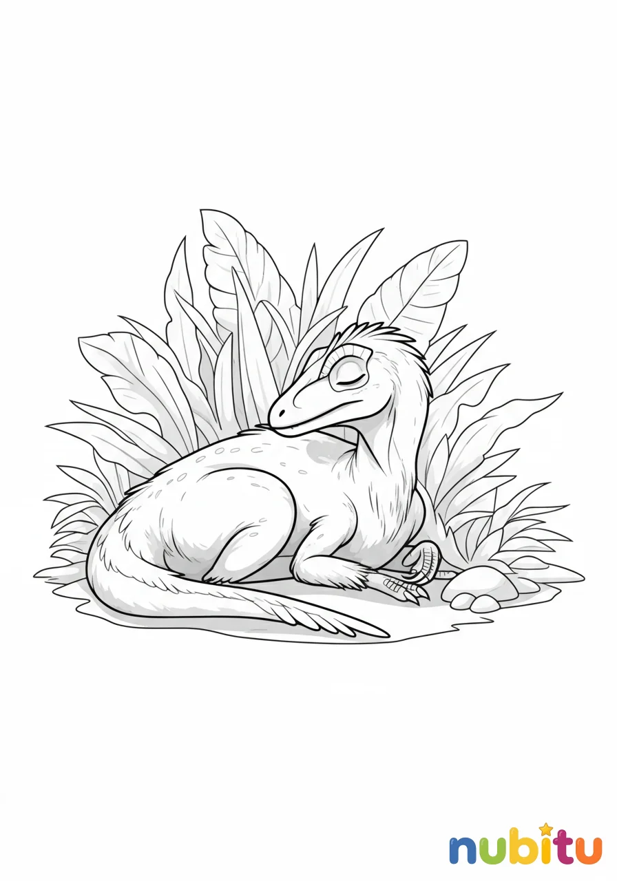 Un graciliraptor adulto descansando tranquilamente bajo la sombra de una planta gigante, con su cuerpo esbelto relajado y sus ojos entrecerrados, capturando un momento de paz en la prehistoria.