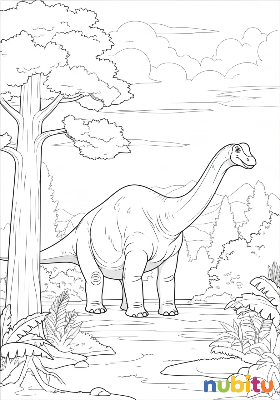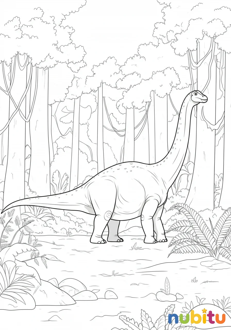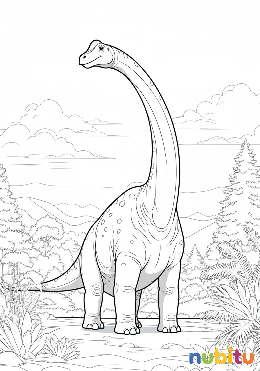 Este majestuoso Huanghetitan está esperando tus lápices de colores. ¿Será verde, marrón o quizás de muchos colores? ¡Tú eres el artista y decides cómo lucirá este increíble dinosaurio!