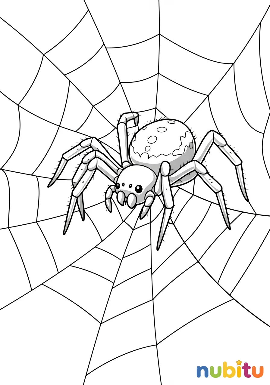 Una arañita amigable, con sus ocho patitas, se prepara para tejer una telaraña brillante, un hogar acogedor en un rincón tranquilo de tu imaginación. ¡Lista para ser coloreada con tus tonos favoritos!