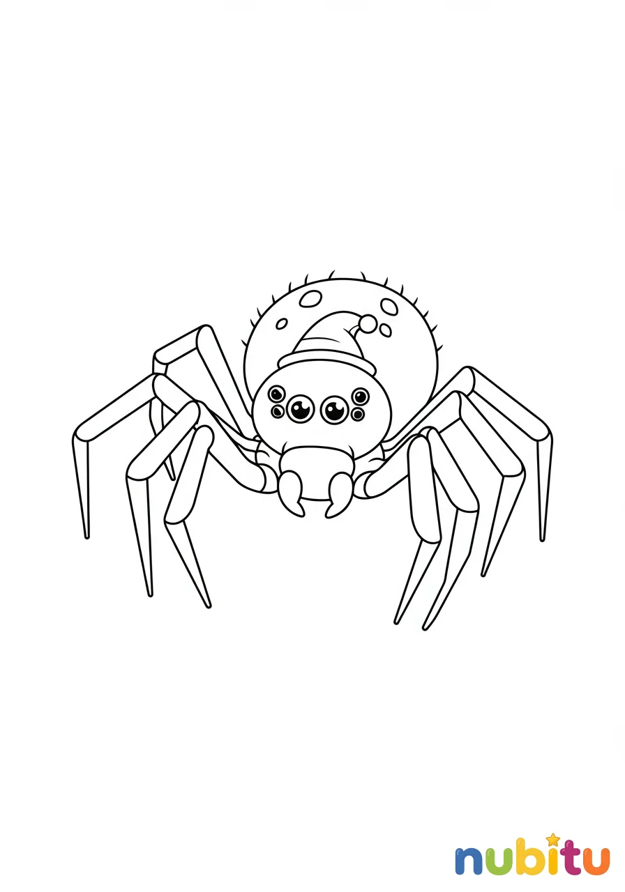 ¡Qué arañita tan coqueta! Con su sombrerito diminuto, nos invita a usar muchos colores para darle vida y alegría a su dibujo. ¡Imagina qué aventuras podría vivir con ese accesorio!