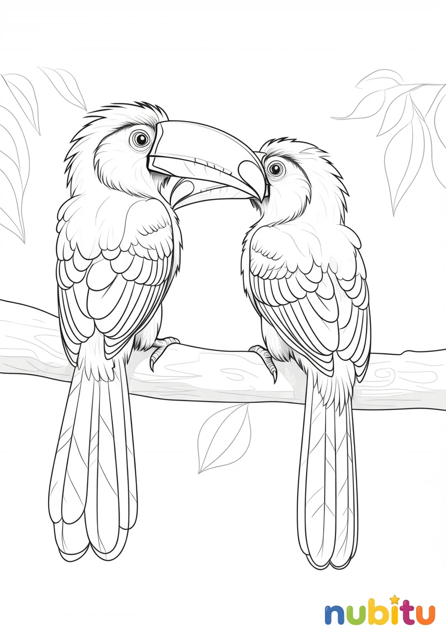 Una dulce escena de dos Arasaris de Collar, quizás una madre y su cría, interactuando suavemente en la selva. Una oportunidad para colorear una tierna conexión familiar.