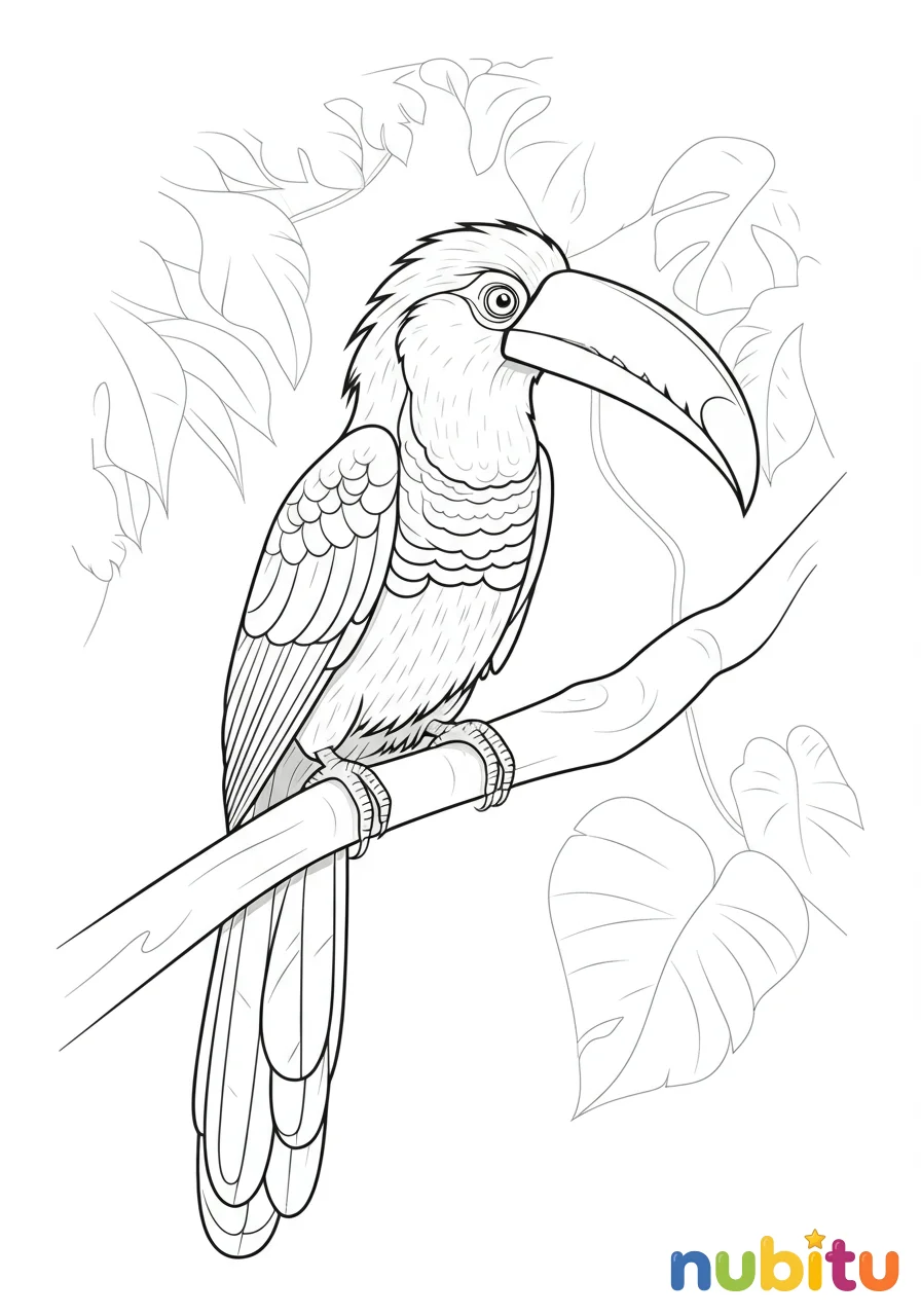 ¡Hola, pequeño artista! Aquí tienes un arasarí muy curioso, mirando todo a su alrededor. ¿Qué colores usarás para que sus plumas y su pico sean los más bonitos de la selva tropical?