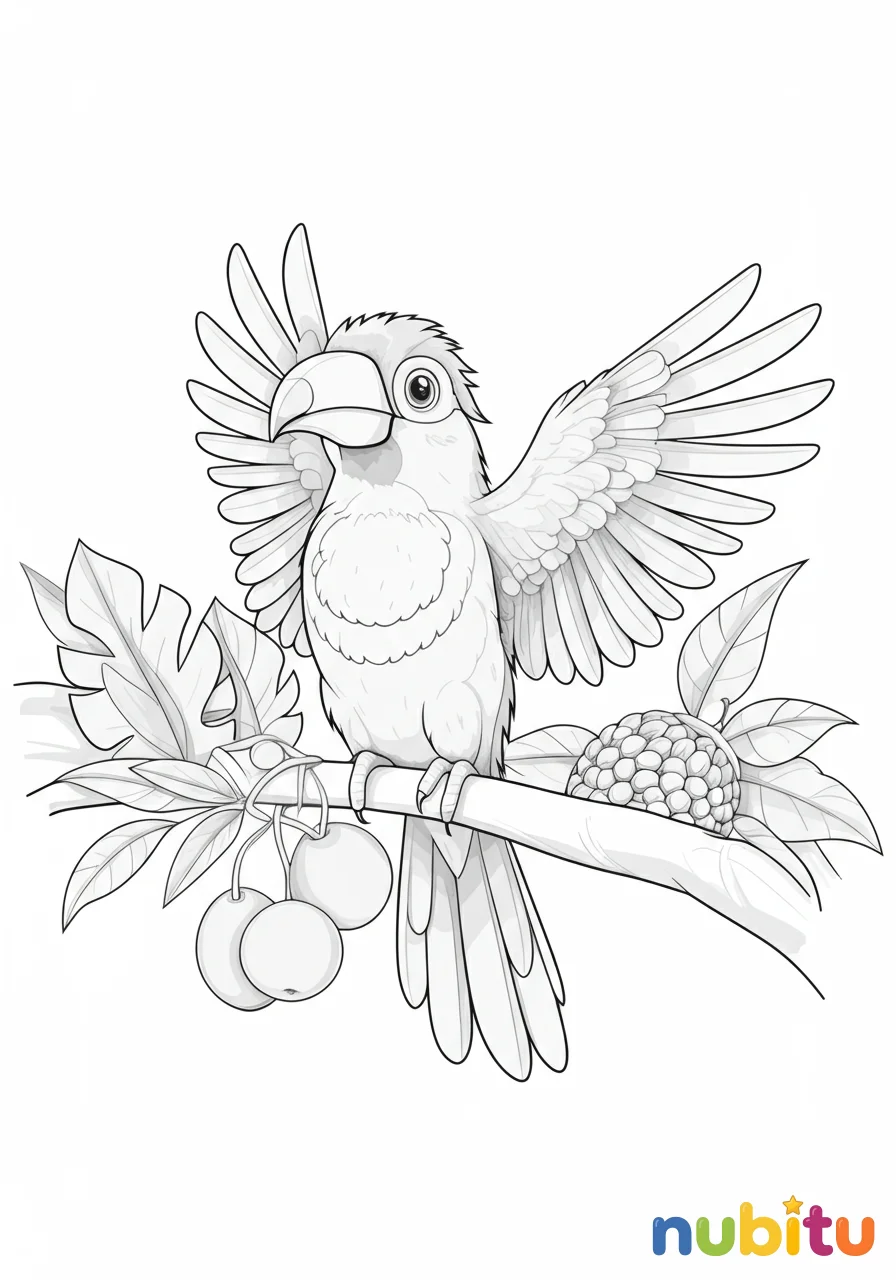 Aquí vemos a un Arasari joven, lleno de energía, saltando entre las frutas más deliciosas de la selva. ¿Qué frutas le pondrás tú a su alrededor? ¡Diviértete creando un festín tropical!