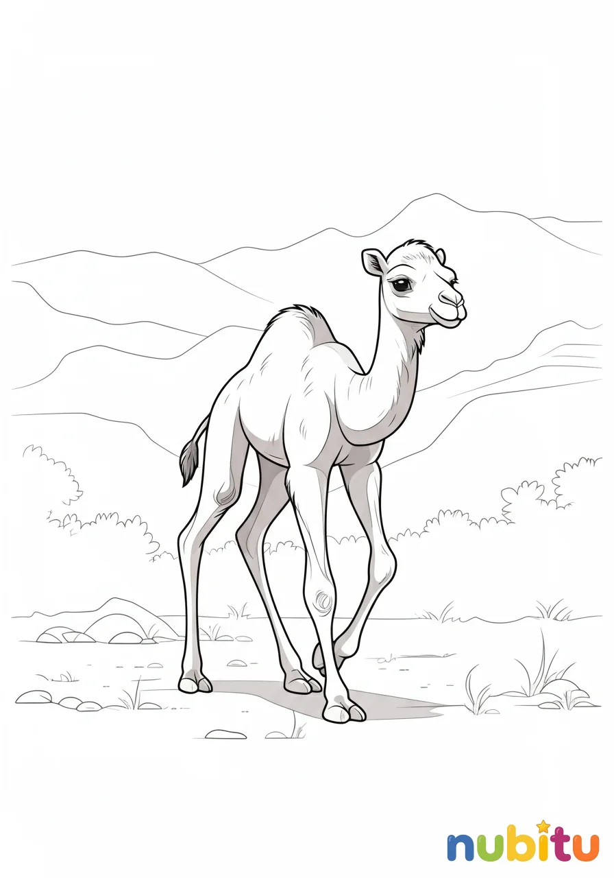 Este dulce camellito bebé, con sus grandes ojos curiosos y sus patitas aún un poco inestables, nos muestra la inocencia de la vida en el desierto. Una escena adorable que inspira a colorear con cariño y delicadeza.