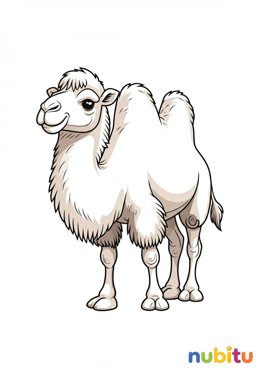 Mira a este camello con dos jorobas, ¡es un camello bactriano! Imagina cómo sería su pelaje al sol del desierto mientras lo coloreas.