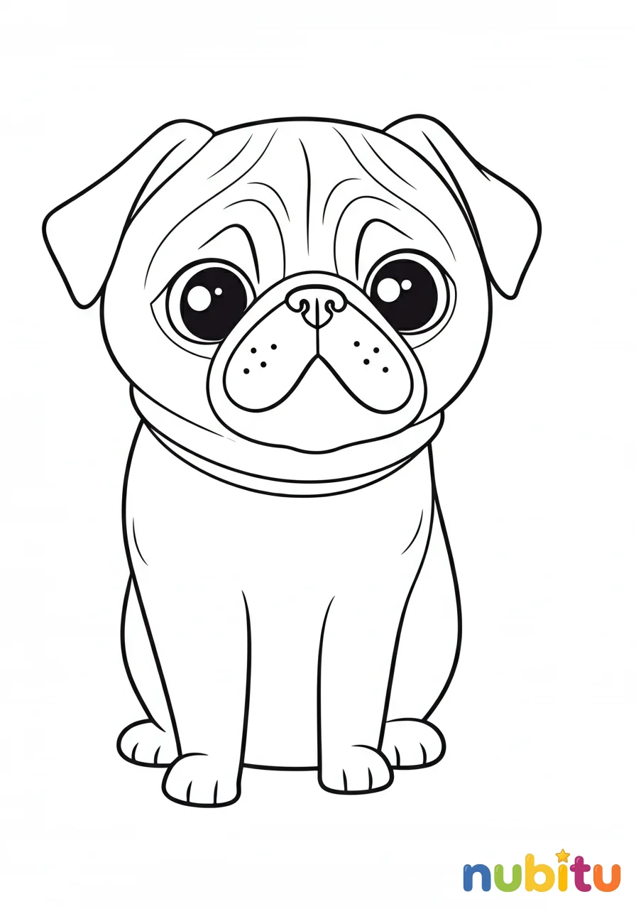 Este carlino está listo para jugar contigo. ¡Imagina los colores más divertidos para su pelaje! No olvides darle una sonrisa muy brillante.