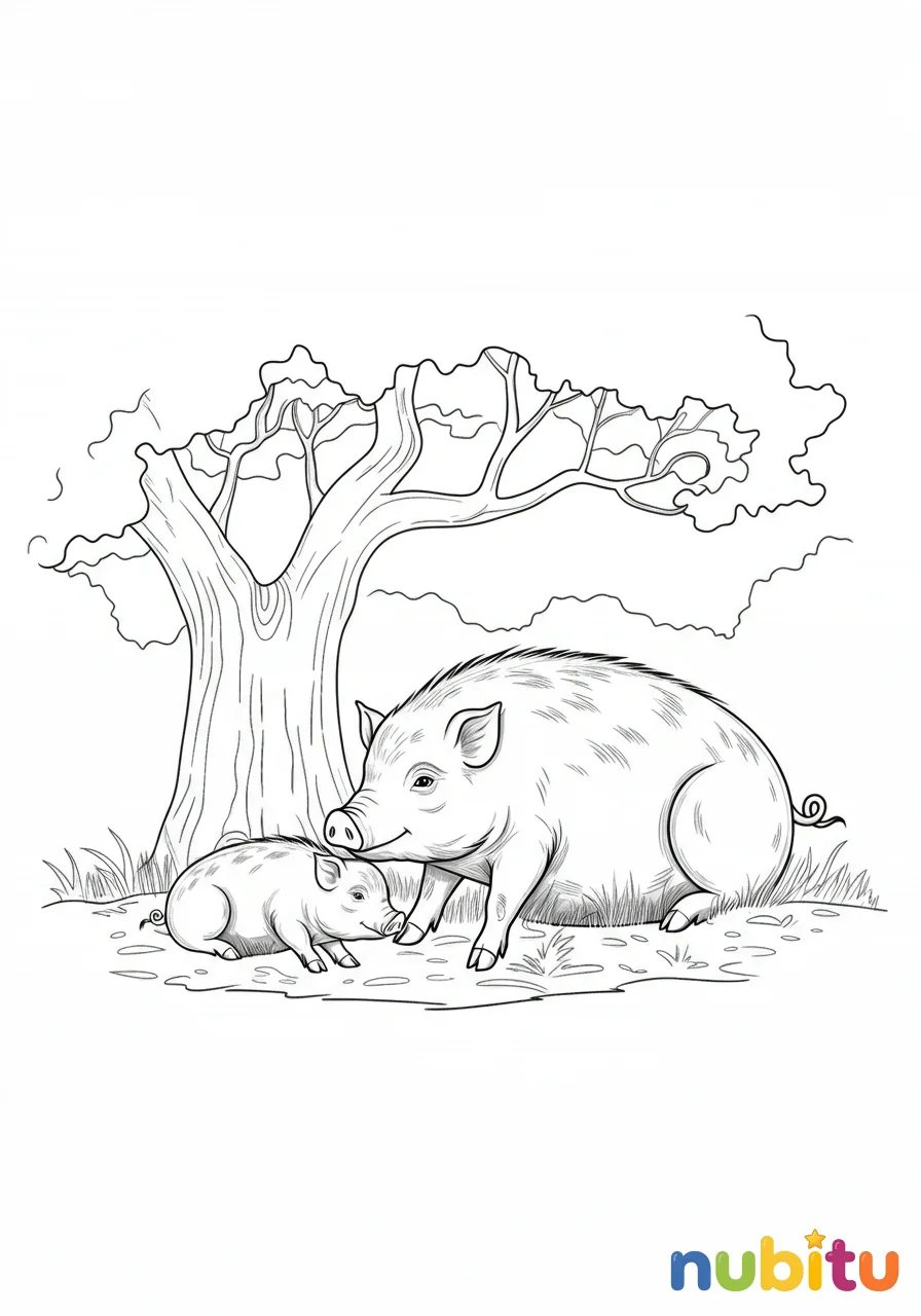 Una escena familiar donde un cerdo adulto y sus crías descansan pacíficamente bajo la sombra de una gran encina. Muestra la vida tranquila y armoniosa de estos animales en su entorno natural.
