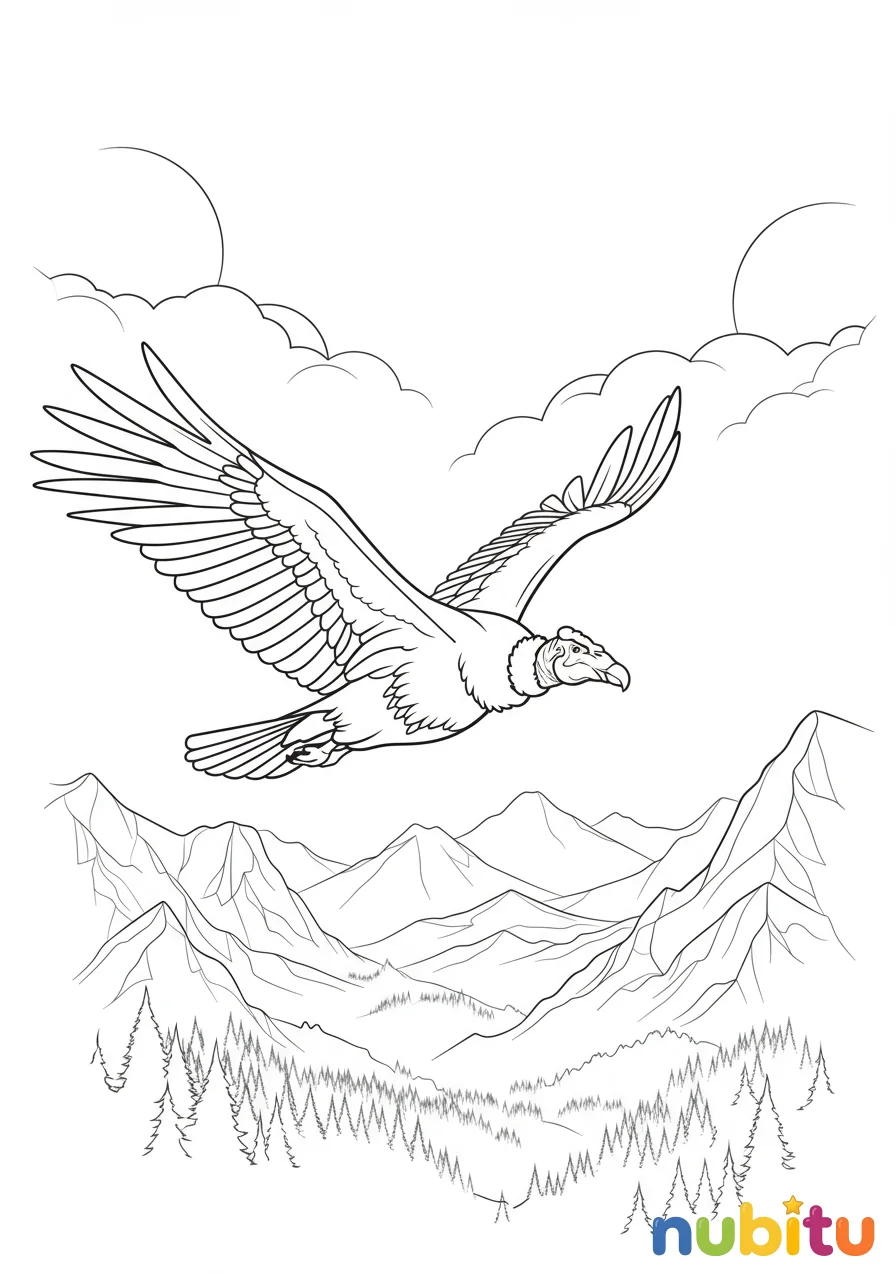Un cóndor de California capturado en pleno vuelo, con sus alas extendidas, deslizándose con gracia sobre un paisaje montañoso. Una imagen que inspira libertad y la inmensidad de la naturaleza para que los pequeños artistas la llenen de vida.