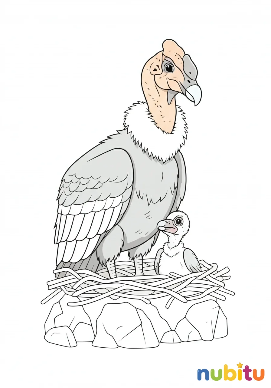Una tierna escena que muestra a un cóndor adulto junto a su cría en un nido escondido entre las rocas. Es un dibujo que resalta la conexión familiar y la protección, perfecto para explorar texturas y sombras.