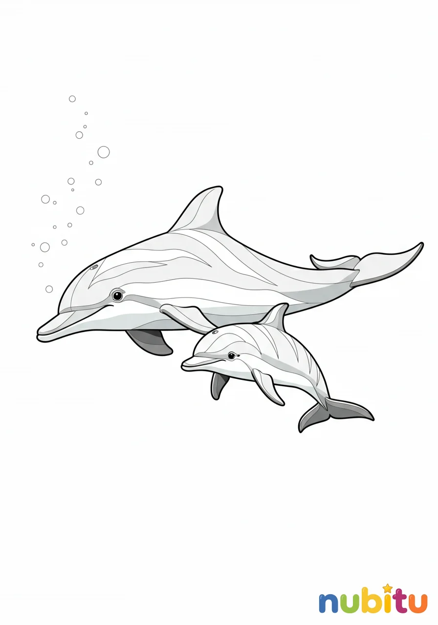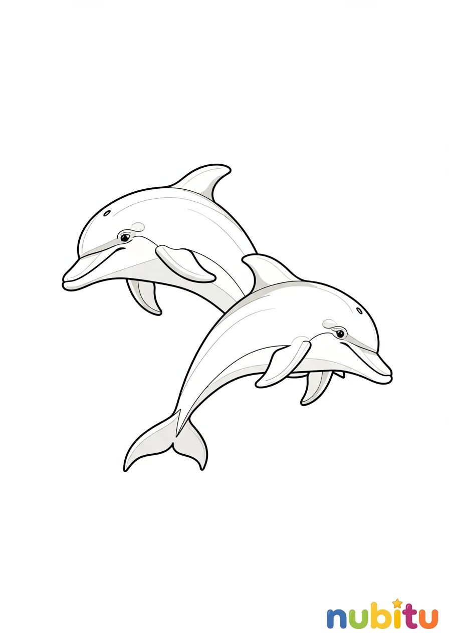 ¡Qué bonito ver a dos delfines nadando juntos! Son los mejores amigos. ¿De qué color serán sus aletas y su cuerpo? ¡Usa tu imaginación para que brillen!