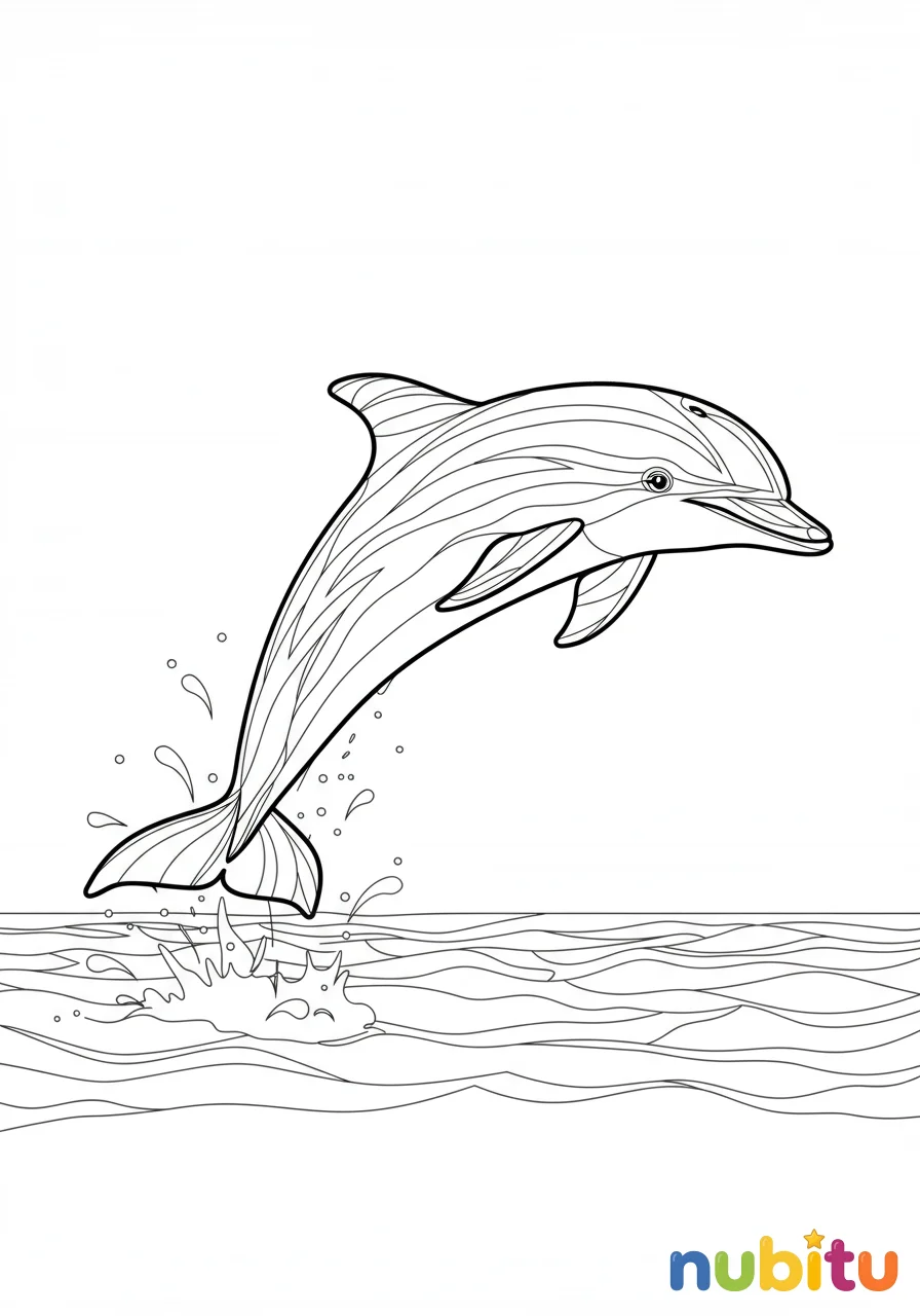 ¡Mira qué gracioso! Este delfín está dando un salto muy alto. Imagina qué colores tan vivos le pondrás para que parezca que está jugando en el mar azul.