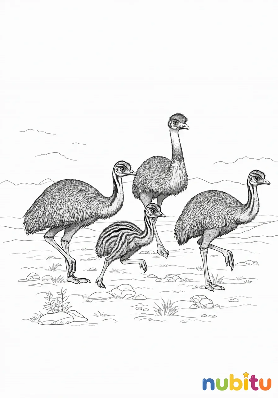 Varios emús jóvenes, con su plumaje rayado característico, corretean y descubren el mundo bajo la atenta mirada de un adulto. Su energía es contagiosa, invitando a los pequeños artistas a capturar su alegría.