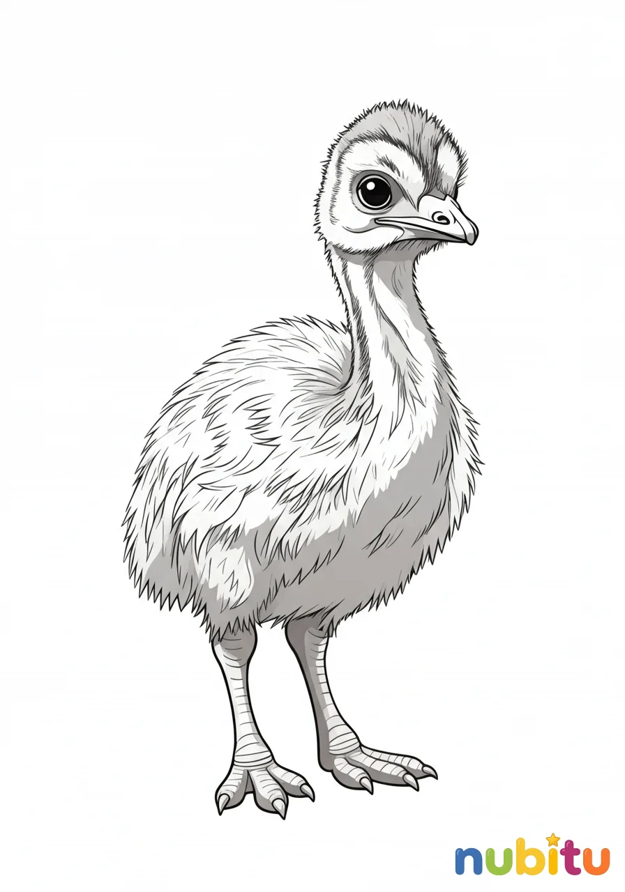 ¡Es un emú bebé! Es pequeño y tiene un plumaje suave. Imagina cómo será de mayor y píntalo con tus colores favoritos para que crezca muy feliz en el dibujo. ¡Qué dulce!