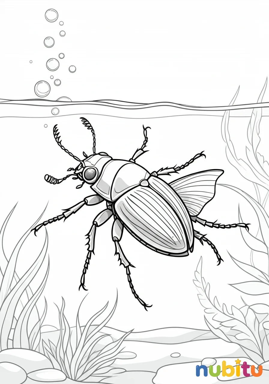¡Dibujar escarabajos buceadores es como tener tu propio acuario mágico en papel! Es súper divertido imaginar cómo se mueven bajo el agua, con sus burbujas de aire y sus patitas como remos. Al dibujarlos, puedes inventarles aventuras submarinas, darles personalidades únicas y hasta crearles un mundo acuático lleno de plantas y peces. ¡Cada línea que trazas es una zambullida en tu imaginación y una forma genial de conocer a estos pequeños héroes del agua!
