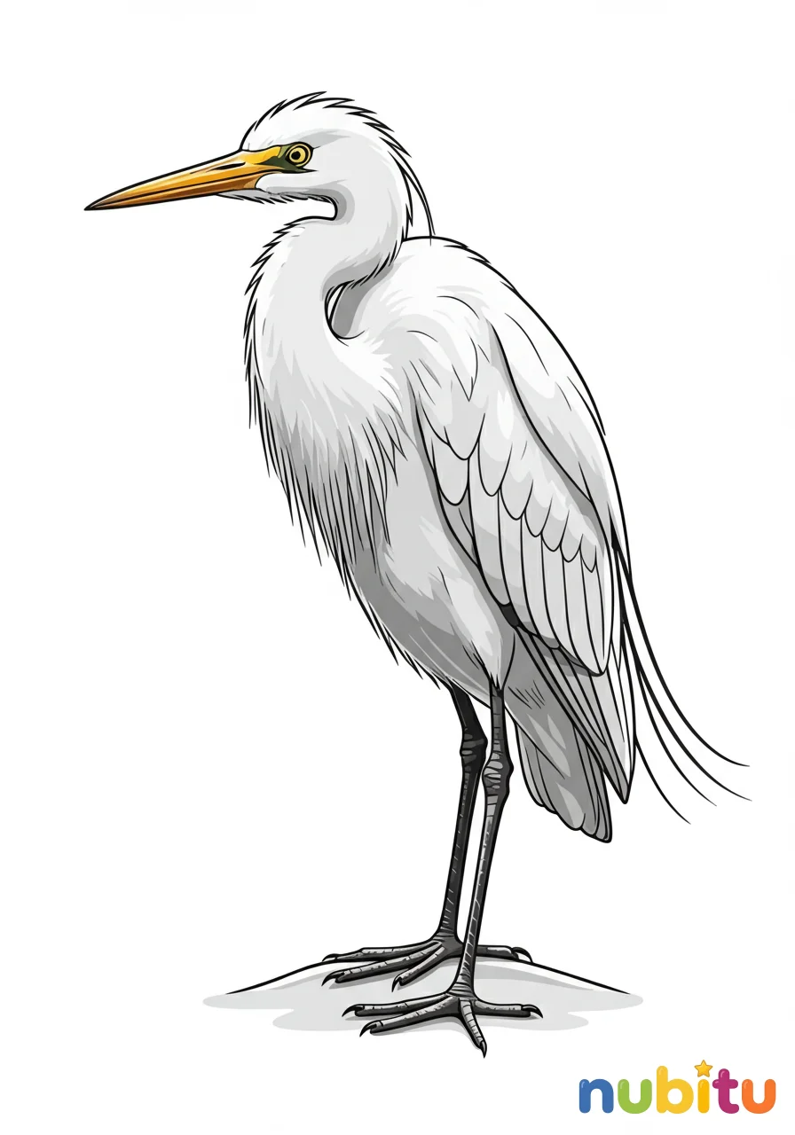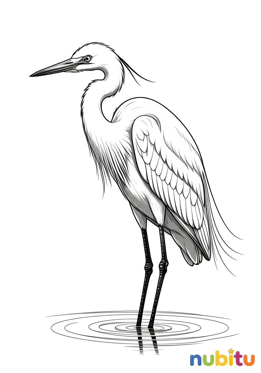 ¡Mira qué garceta tan elegante! Está esperando tranquilamente. ¿De qué color pintarás sus largas patas y su hermoso plumaje?