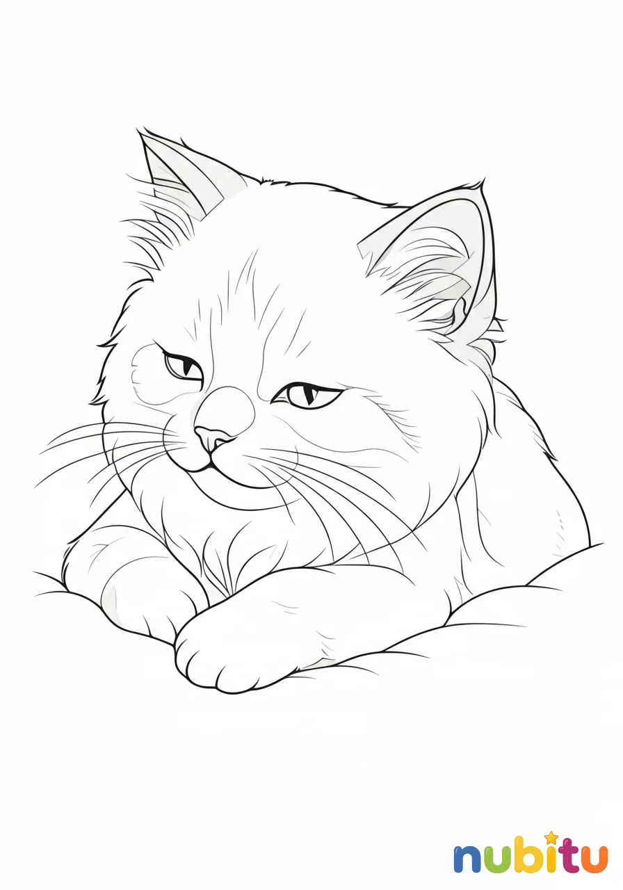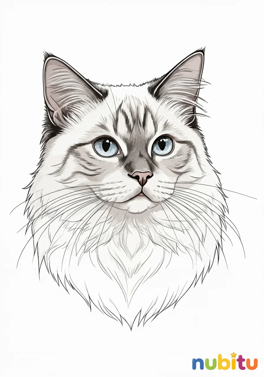 Un primer plano encantador de la carita de un Gato Sagrado de Birmania, con todos sus detalles finos, perfecto para practicar la precisión y el cariño al colorear.