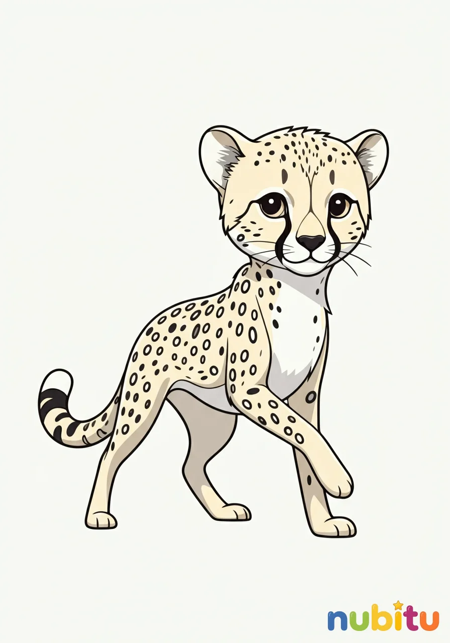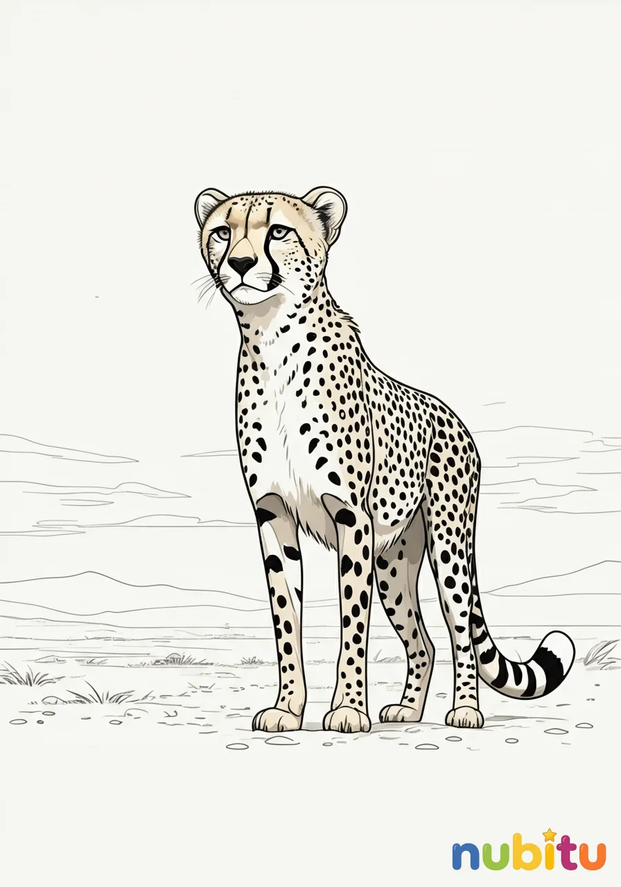 Este guepardo es el más rápido de África. ¡Sus manchas son únicas! ¿Puedes imaginar cómo se verían sus puntos negros y su pelaje dorado cuando lo colorees?
