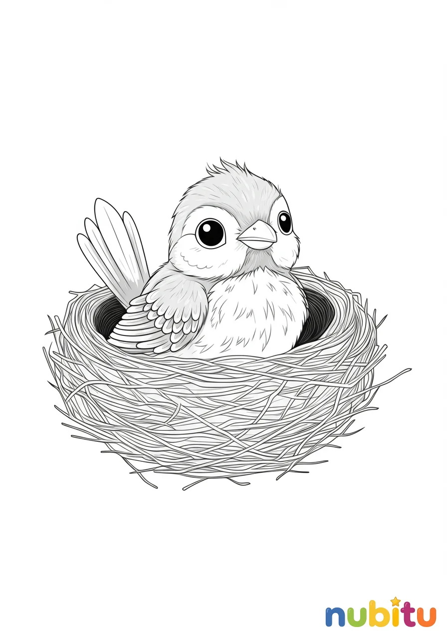 Una tierna representación de un herrerillo bebé asomando su pequeña cabeza desde la seguridad de su nido. La imagen evoca calidez y protección, con el nido texturizado que espera ser adornado con tonos suaves y acogedores.