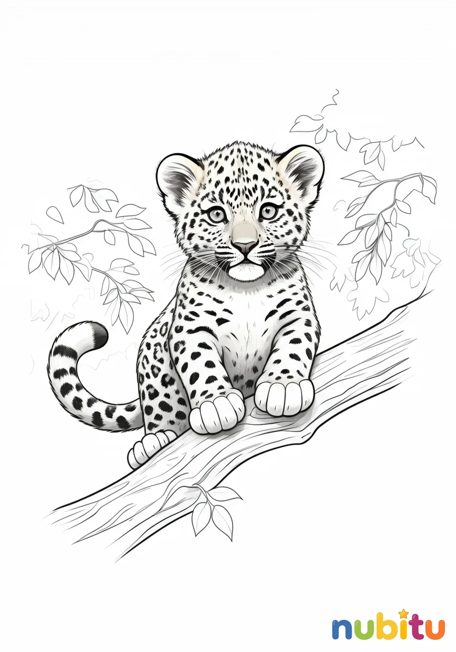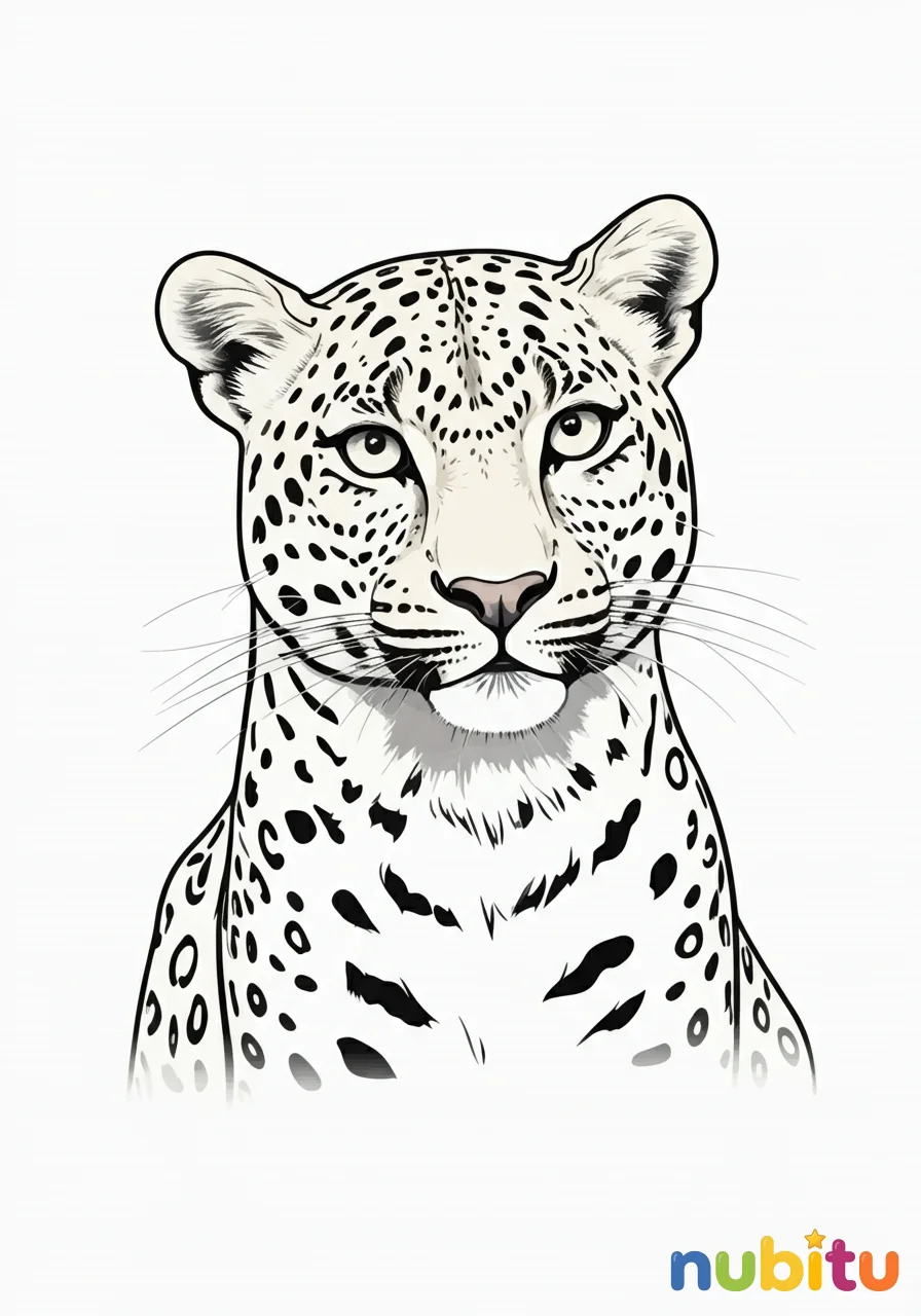 ¡Hola! Este leopardo de Amur te mira con curiosidad. Concéntrate en sus ojitos y sus manchas. ¿De qué color serán sus ojos? ¡Usa tu creatividad para darle vida a este amigo salvaje!