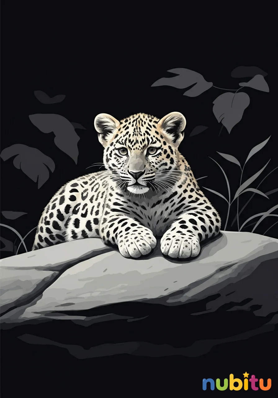 Un tierno cachorro de Leopardo de Amur, con su mirada curiosa, explorando el suelo del bosque. Sus pequeñas patas y su expresión atenta invitan a la imaginación sobre sus primeras aventuras. Un dibujo que inspira dulzura y la belleza de la vida salvaje en sus inicios.