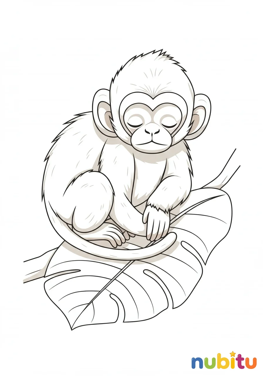 Un dulce mono chato bebé descansa plácidamente, acurrucado en una hoja grande o una rama suave. Su carita redonda transmite una sensación de paz y tranquilidad, invitando a los pequeños artistas a usar colores suaves y relajantes.