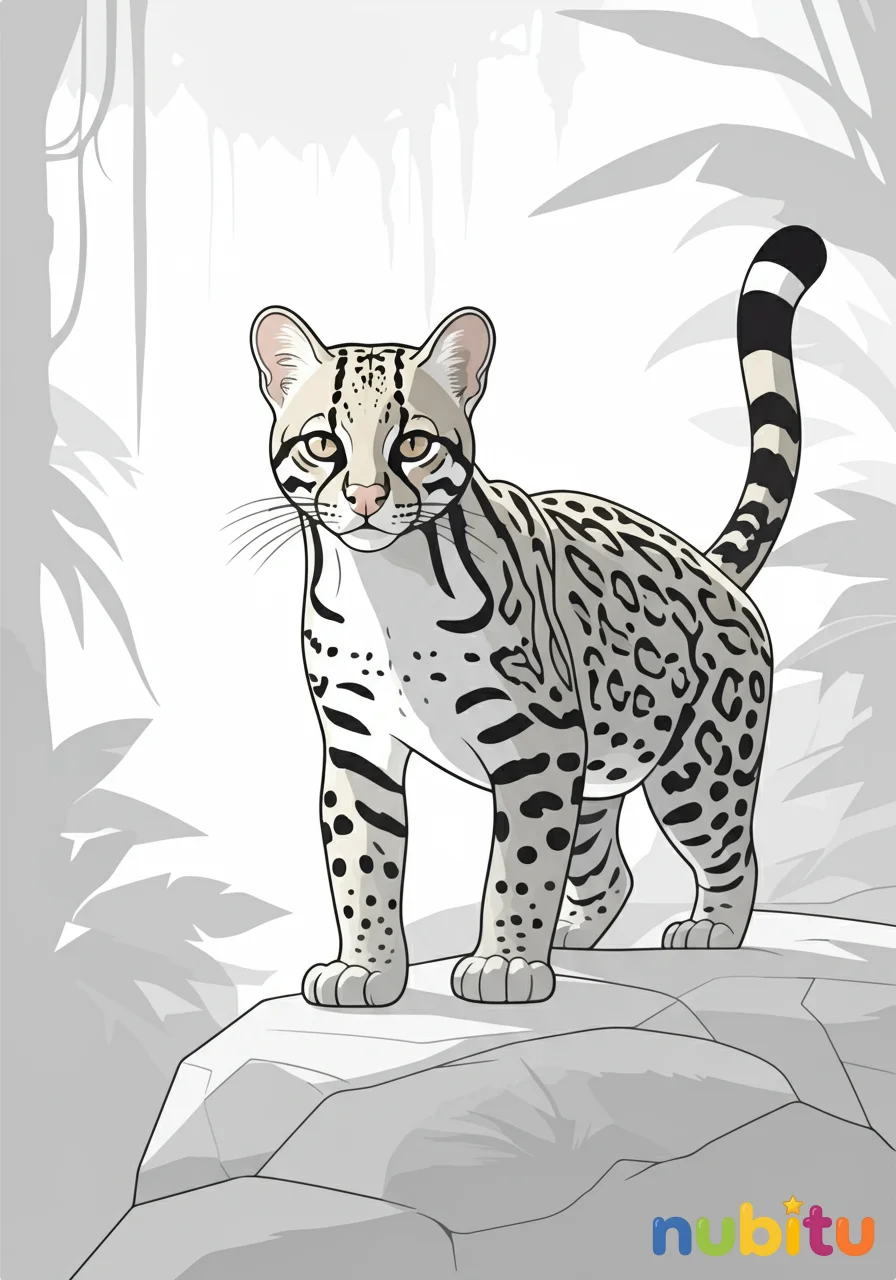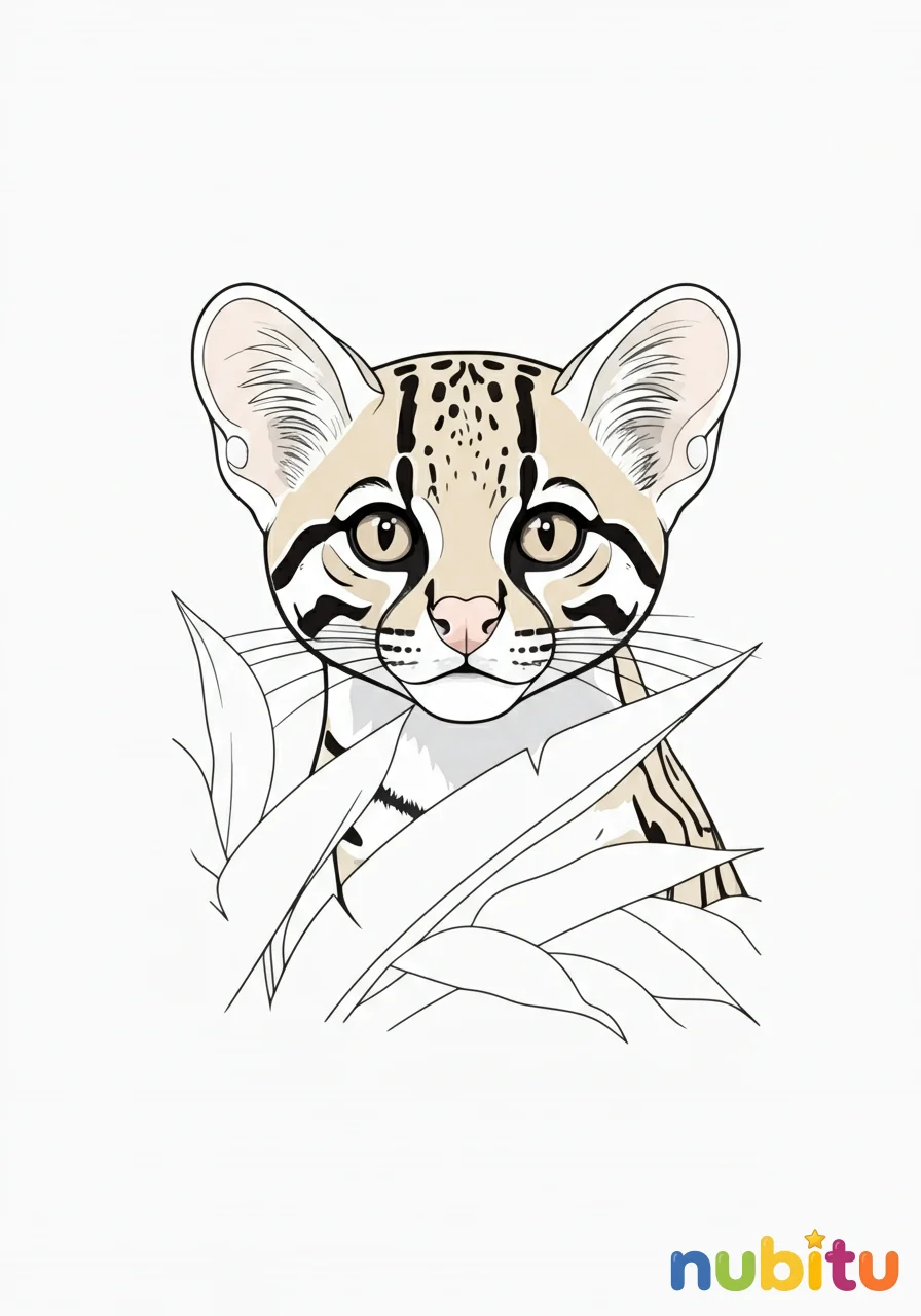 Este ocelote es muy curioso y le encanta explorar. ¡Imagínate qué colores tan bonitos tendrá su pelaje cuando termines de pintarlo! Sus ojos esperan tu toque mágico.