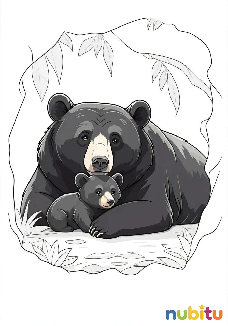 Una escena conmovedora de una mamá osa negra asiática junto a su osezno, quizás acurrucados en una cueva o descansando bajo la sombra de un árbol. Refleja la ternura y el vínculo familiar en la naturaleza.
