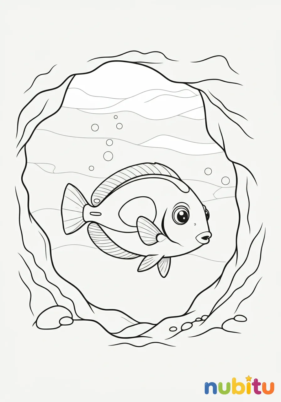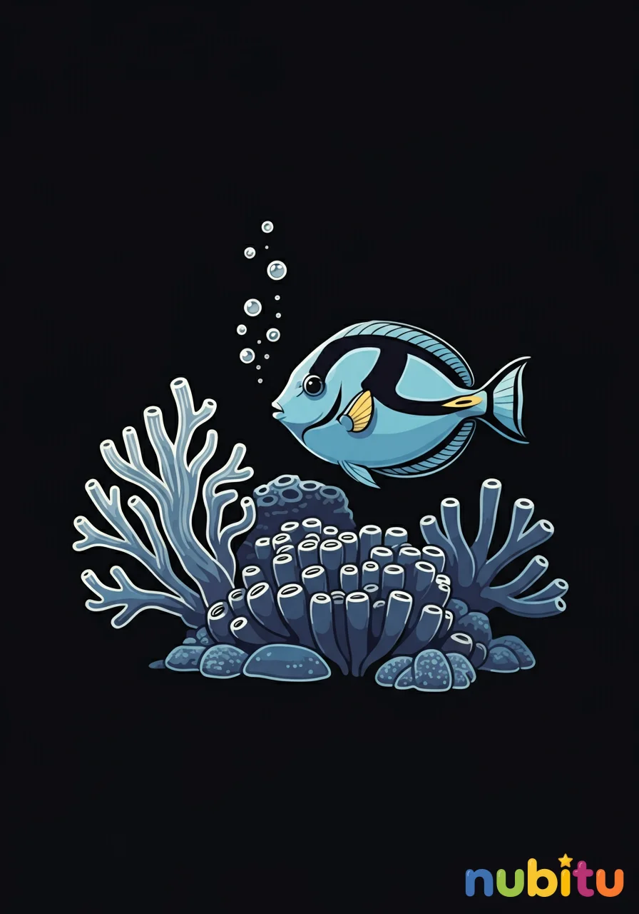 Un adorable pez cirujano con una expresión curiosa, explorando un rincón del océano. Es perfecto para los pequeños que aman las historias de aventura y descubrimiento.