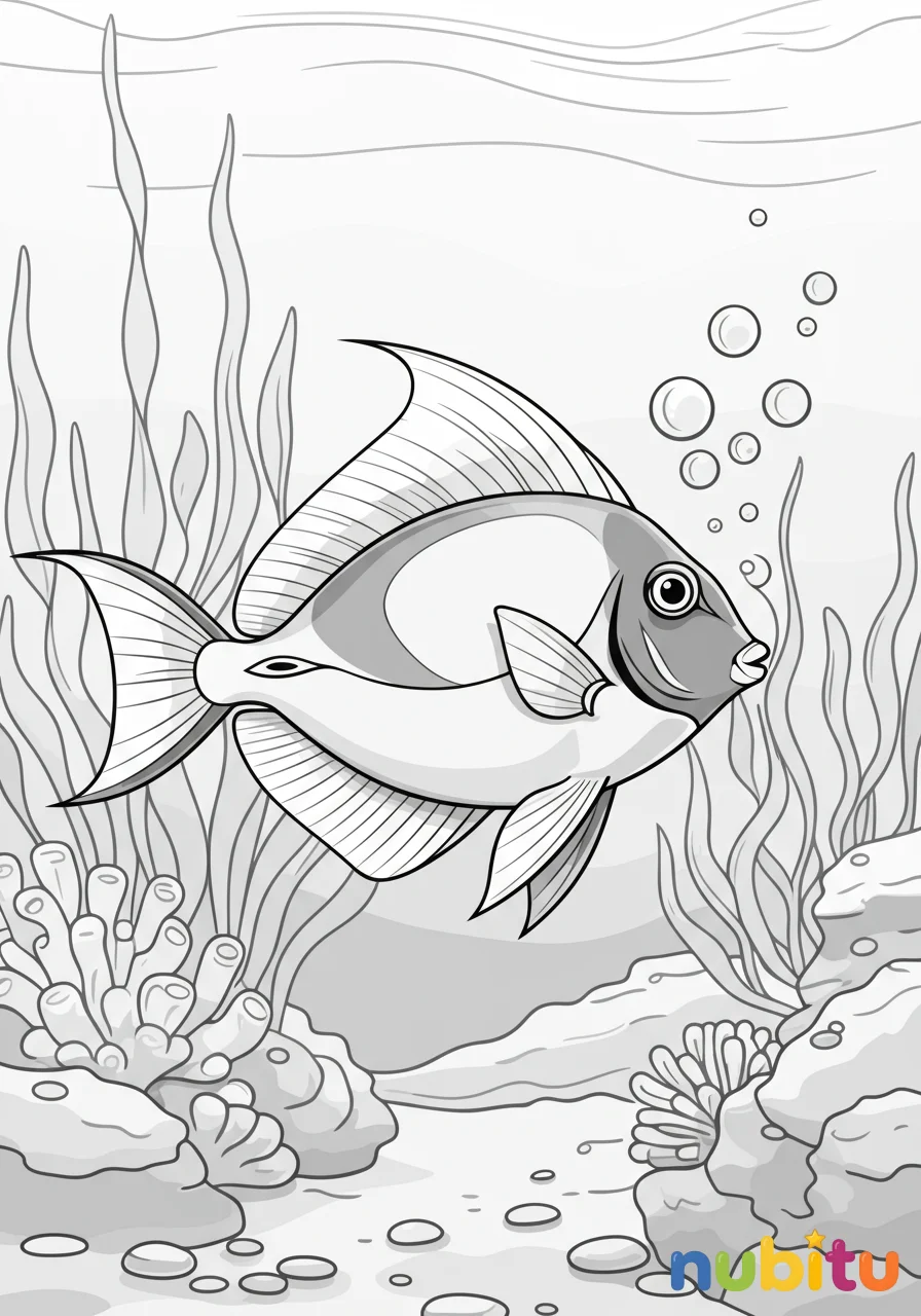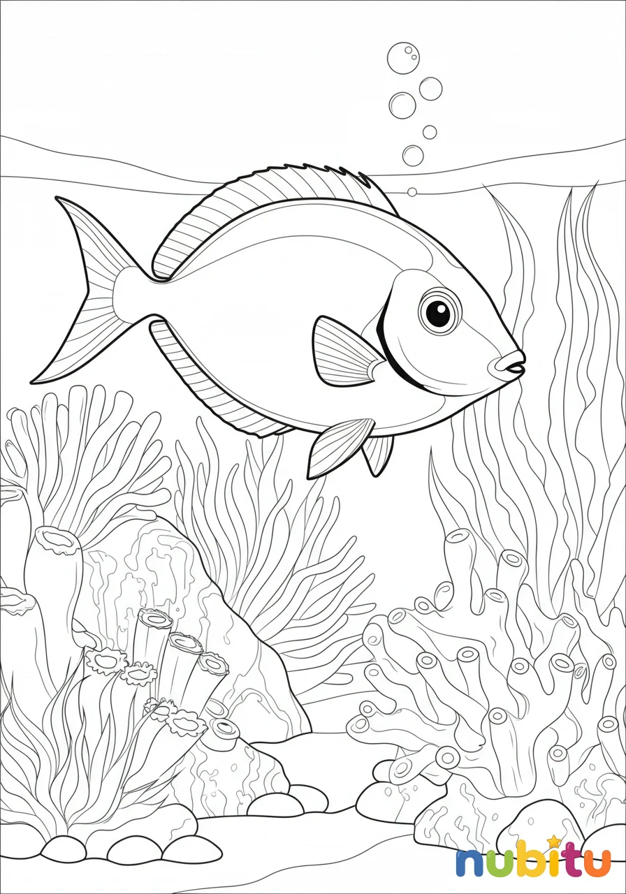 Este dibujo nos muestra a un pez cirujano adulto, con sus aletas extendidas, disfrutando de la tranquilidad de su hábitat natural entre algas y burbujas. Es una escena serena que invita a la calma y a explorar los detalles del entorno.