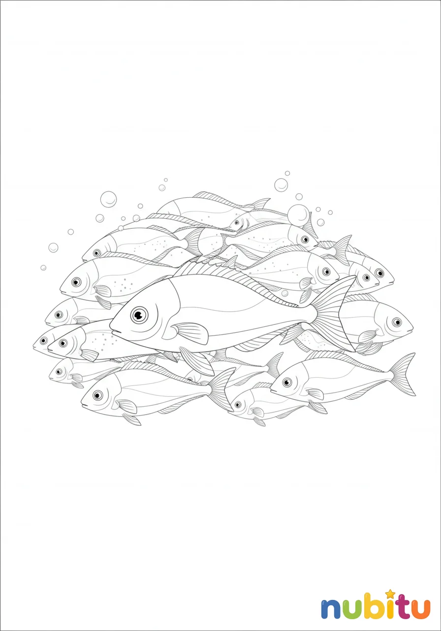 Una vibrante escena submarina donde varios peces cirujanos de diferentes tamaños se mueven en cardumen, mostrando la belleza de la vida marina en comunidad. Este dibujo ofrece la oportunidad de experimentar con diferentes patrones y texturas.