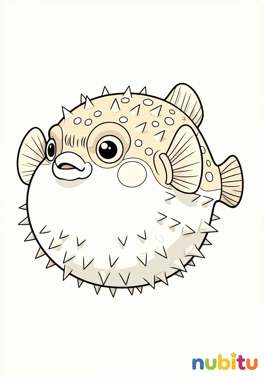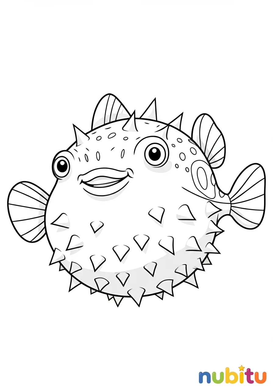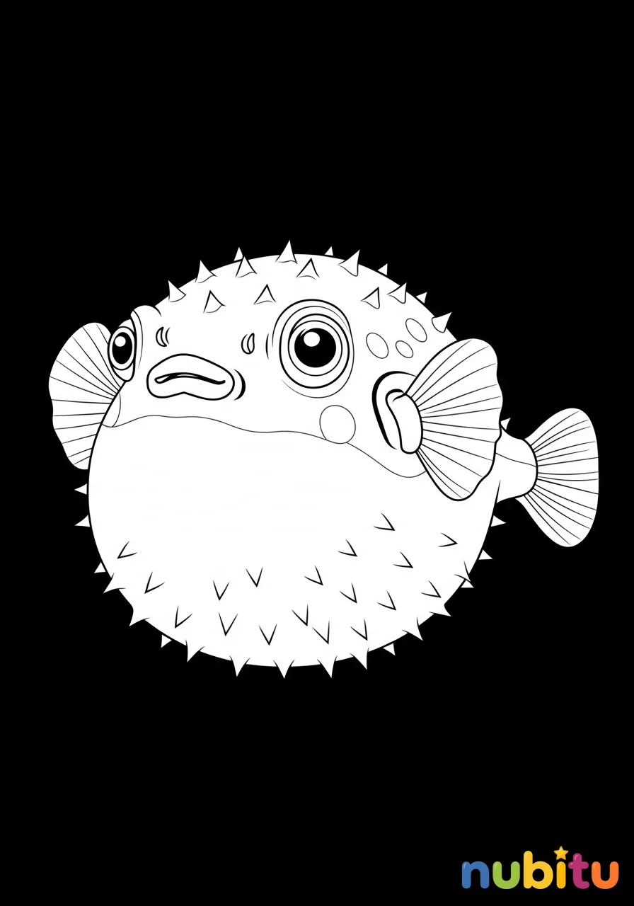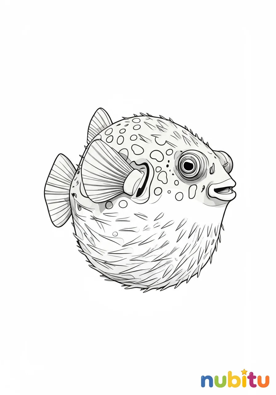 Este dibujo presenta un pez globo de agua dulce con una expresión amigable, sus aletas en movimiento suave y su forma hinchada, invitando a la creatividad al colorear.