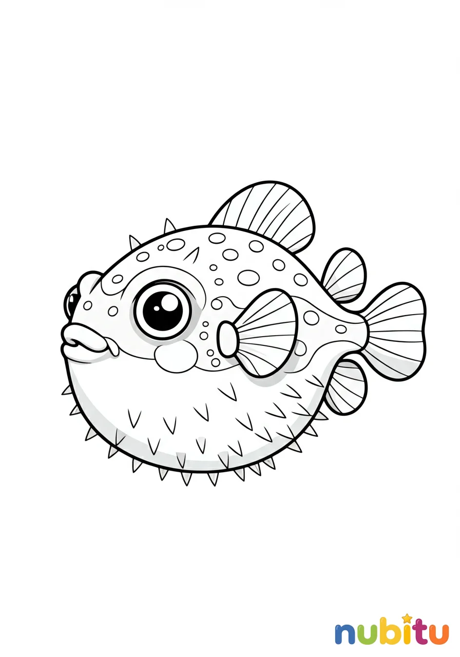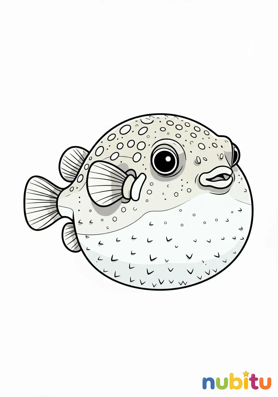 Un adorable pez globo de agua dulce con su cuerpo redondeado, aletas delicadas y una expresión curiosa, listo para ser llenado de color.