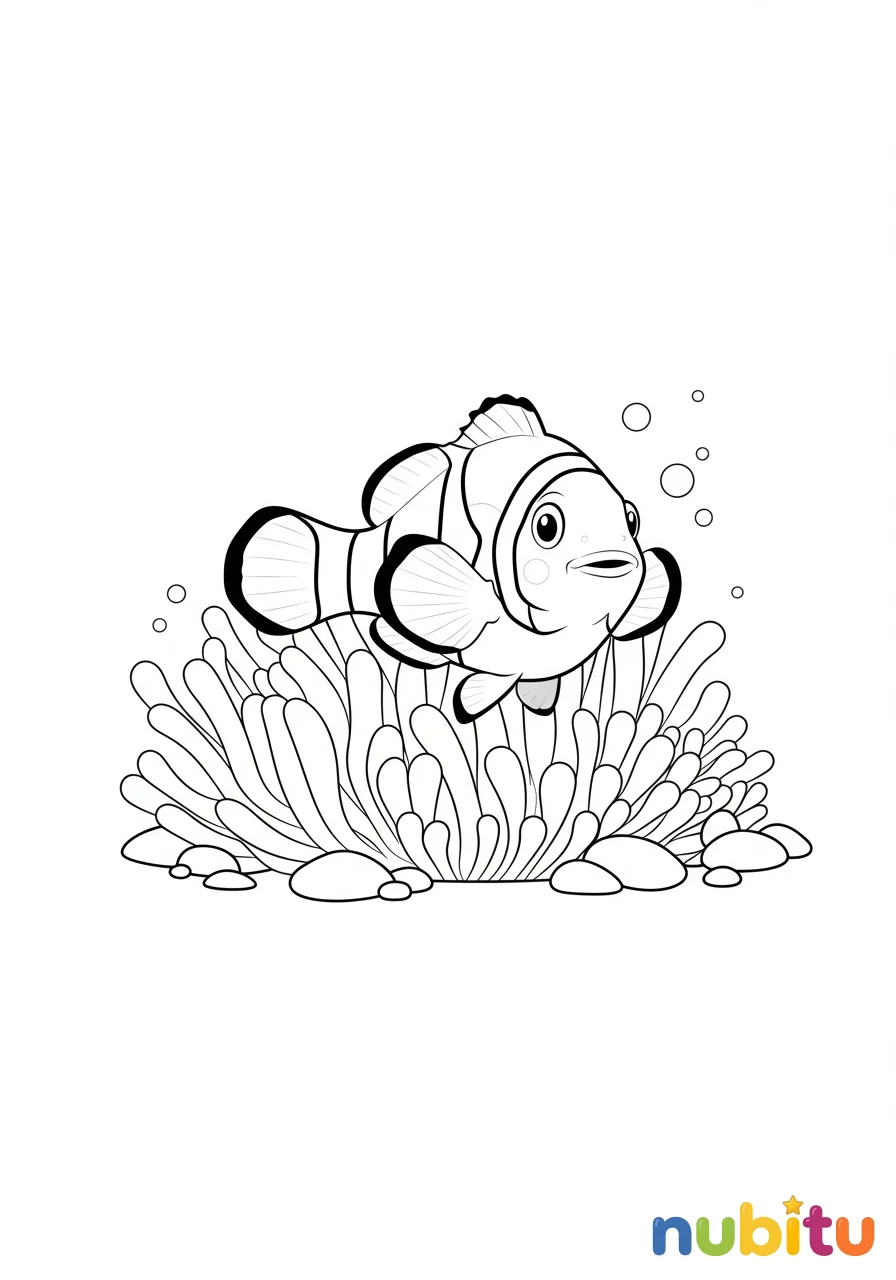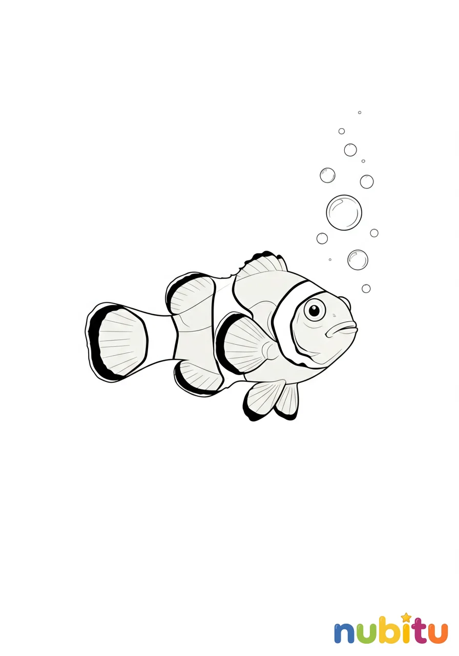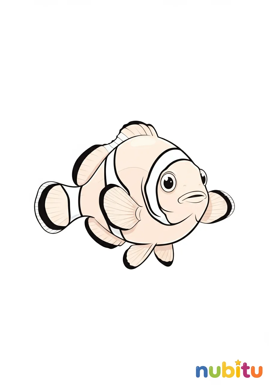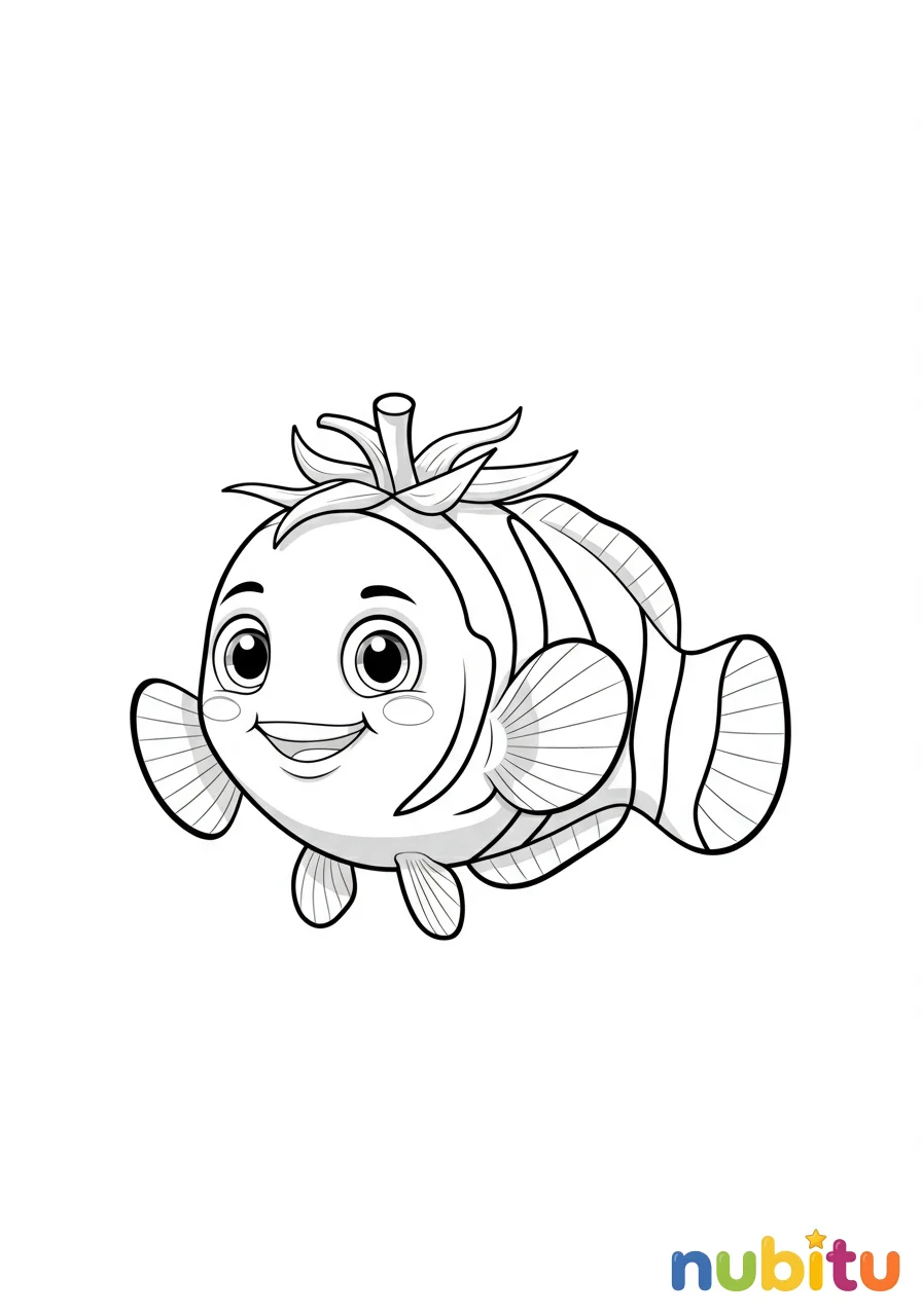 Este pez payaso tomate está muy curioso y te mira con sus grandes ojos. ¿Qué colores usarás para sus aletas y su cuerpo? ¡Usa tu imaginación para crear un pez único y divertido!