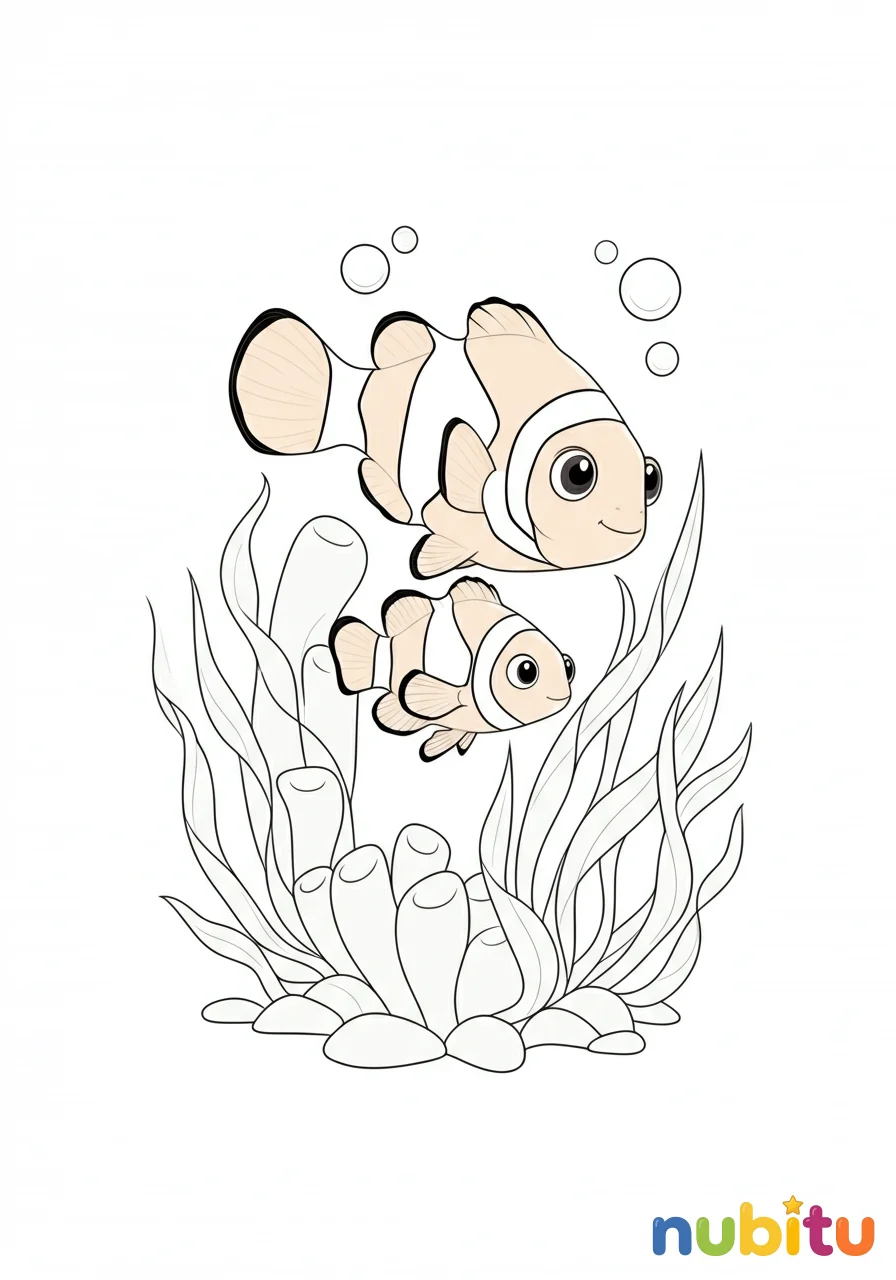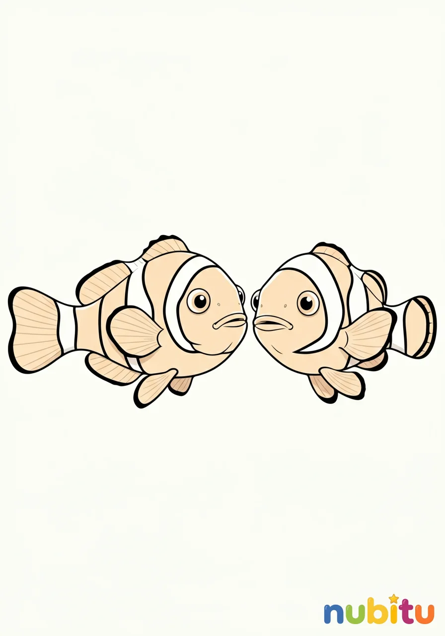 ¡Mira qué par de amigos tan especiales! Estos dos peces payaso tomate nadan juntos y te invitan a unirte a su aventura. ¡Colorea sus rayas y hazlos brillar como nunca!