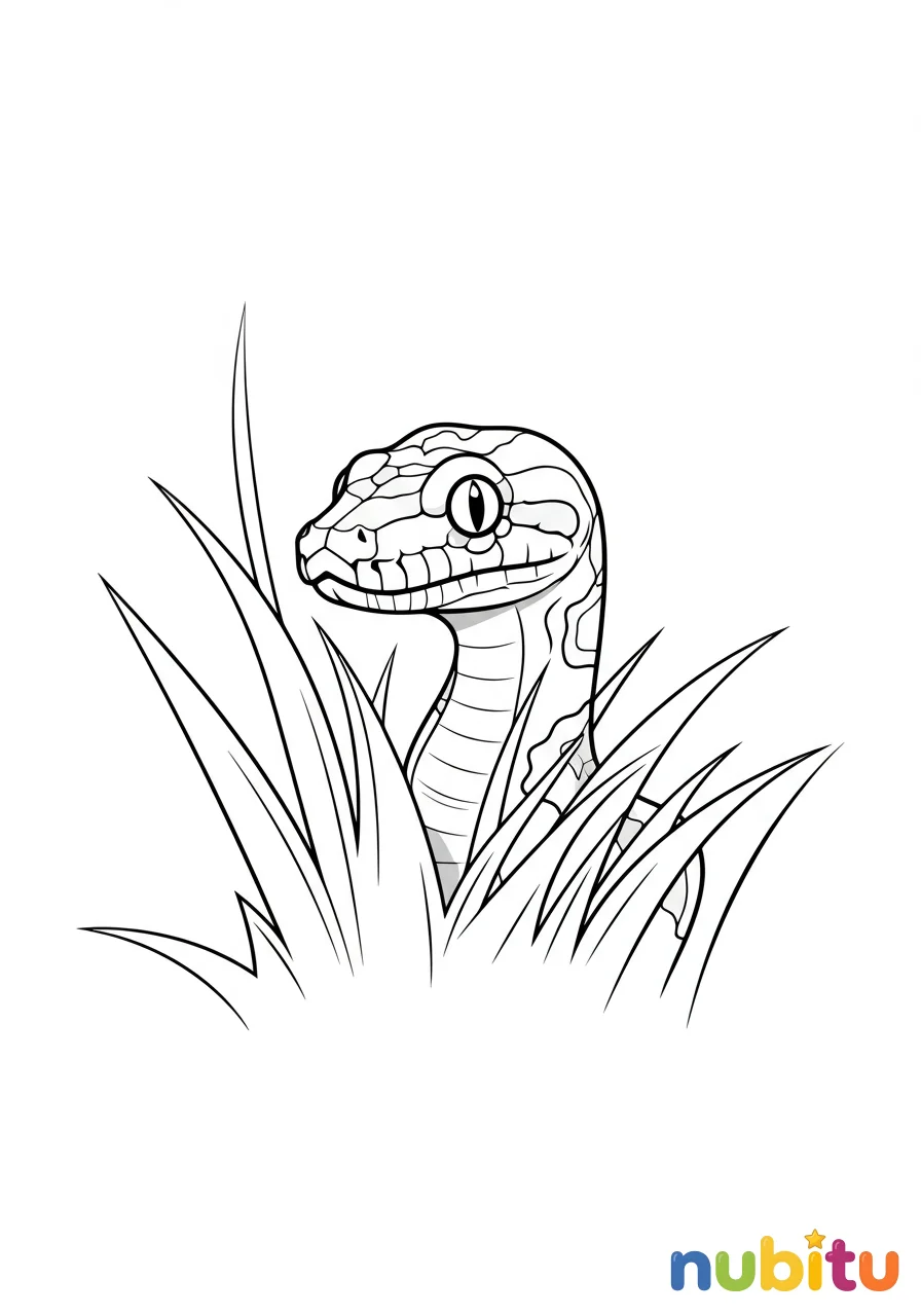 Una pequeña y adorable cría de pitón de Birmania se asoma curiosa desde el pasto alto, con su cuerpo curvado, lista para una nueva aventura de color y creatividad.