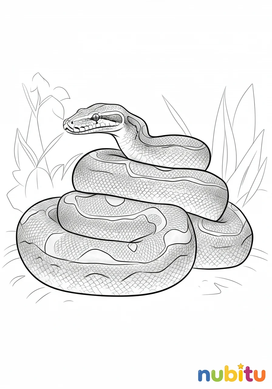 Aquí vemos una pitón de Birmania enrollada con elegancia, mostrando sus fascinantes patrones naturales que esperan ser llenados de vida con tus colores y tu imaginación artística.
