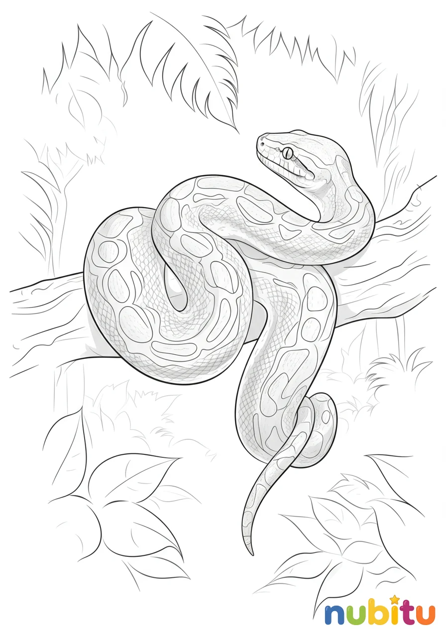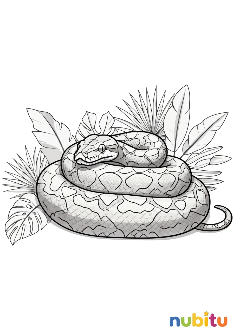 Una majestuosa pitón de Birmania en una pose de descanso, enrollada suavemente, mostrando sus patrones únicos y su gran tamaño. Ideal para pequeños artistas que disfrutan de los detalles.